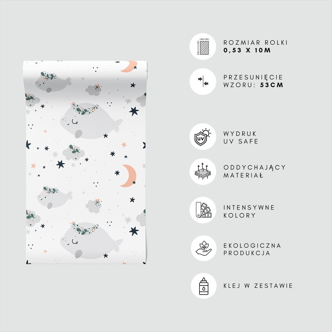 Odkryj piękno i funkcjonalność tapety z motywem dziecięca, wieloryby, gwiazdy, księżyc. To połączenie wyjątkowego wzornictwa z łatwością aplikacji, doskonałe do każdego pomieszczenia.