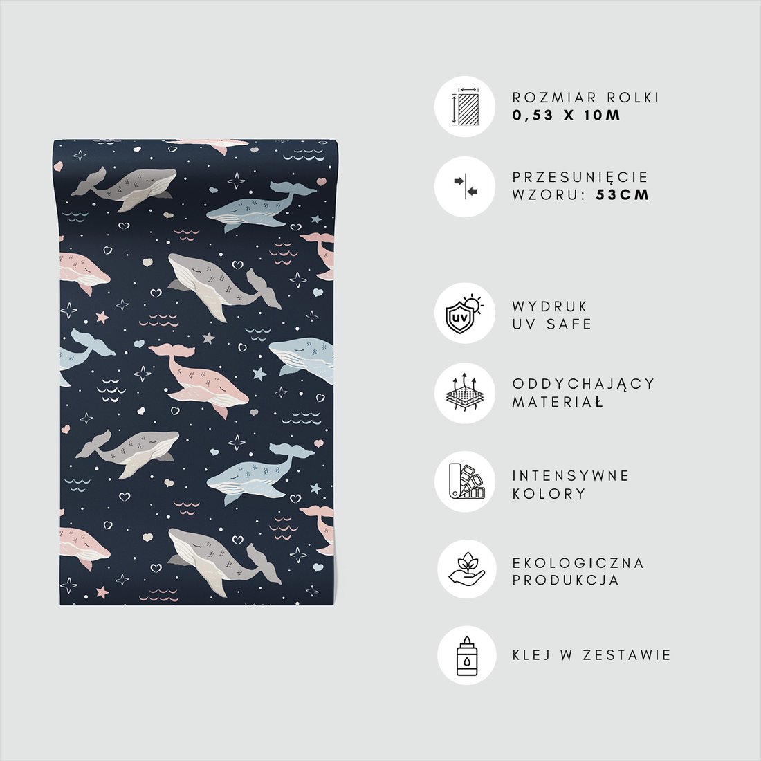 Tapeta - dziecięca, wieloryby, gwiazdy, serca