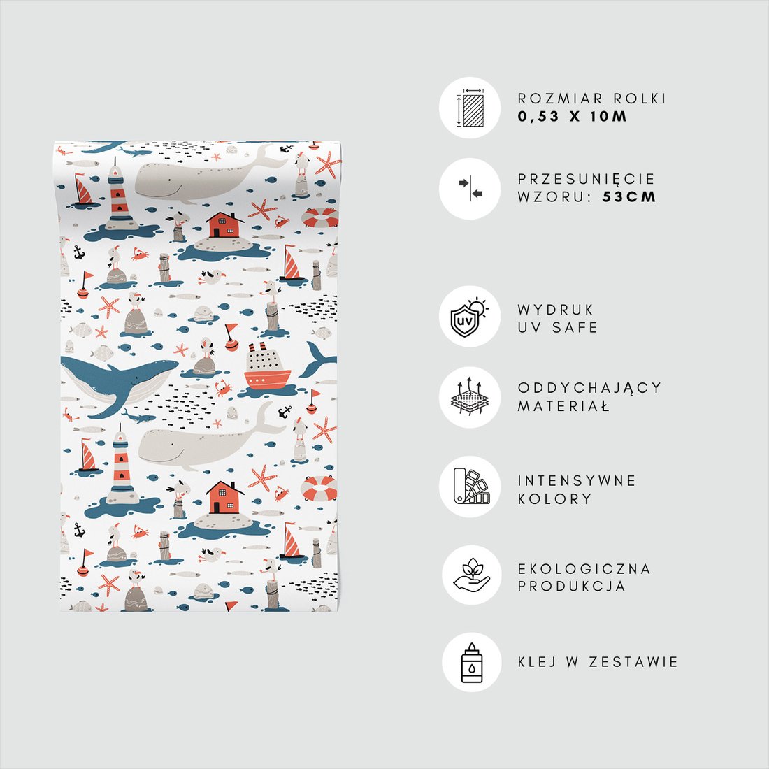 - Tapeta - dziecięca, wieloryby, mewy, morze