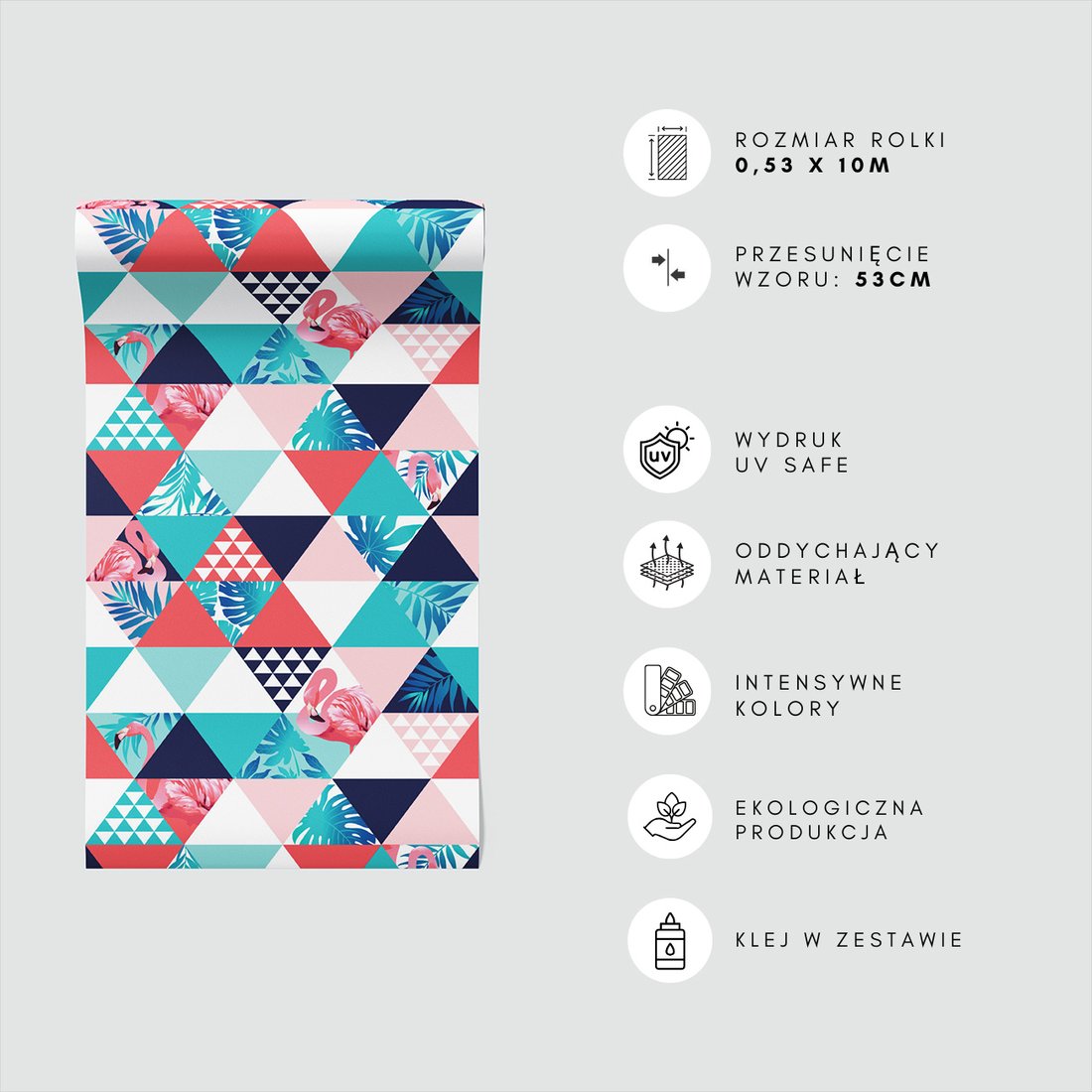 Odkryj piękno i funkcjonalność tapety z motywem flaming, trójkąt, liście. To połączenie wyjątkowego wzornictwa z łatwością aplikacji, doskonałe do każdego pomieszczenia.