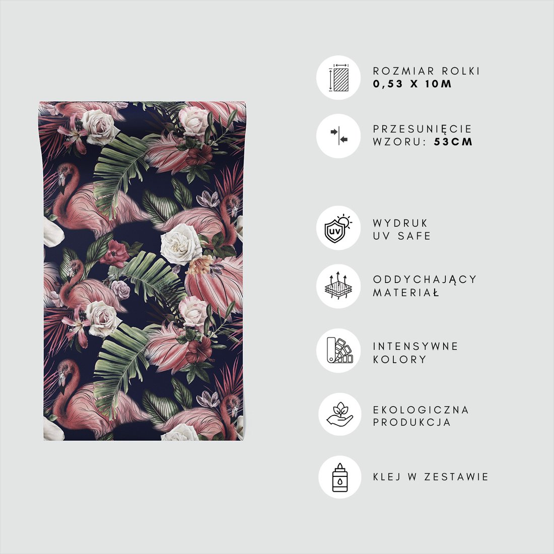 Odkryj piękno i funkcjonalność tapety z motywem flamingo, liście, kwiaty. To połączenie wyjątkowego wzornictwa z łatwością aplikacji, doskonałe do każdego pomieszczenia.