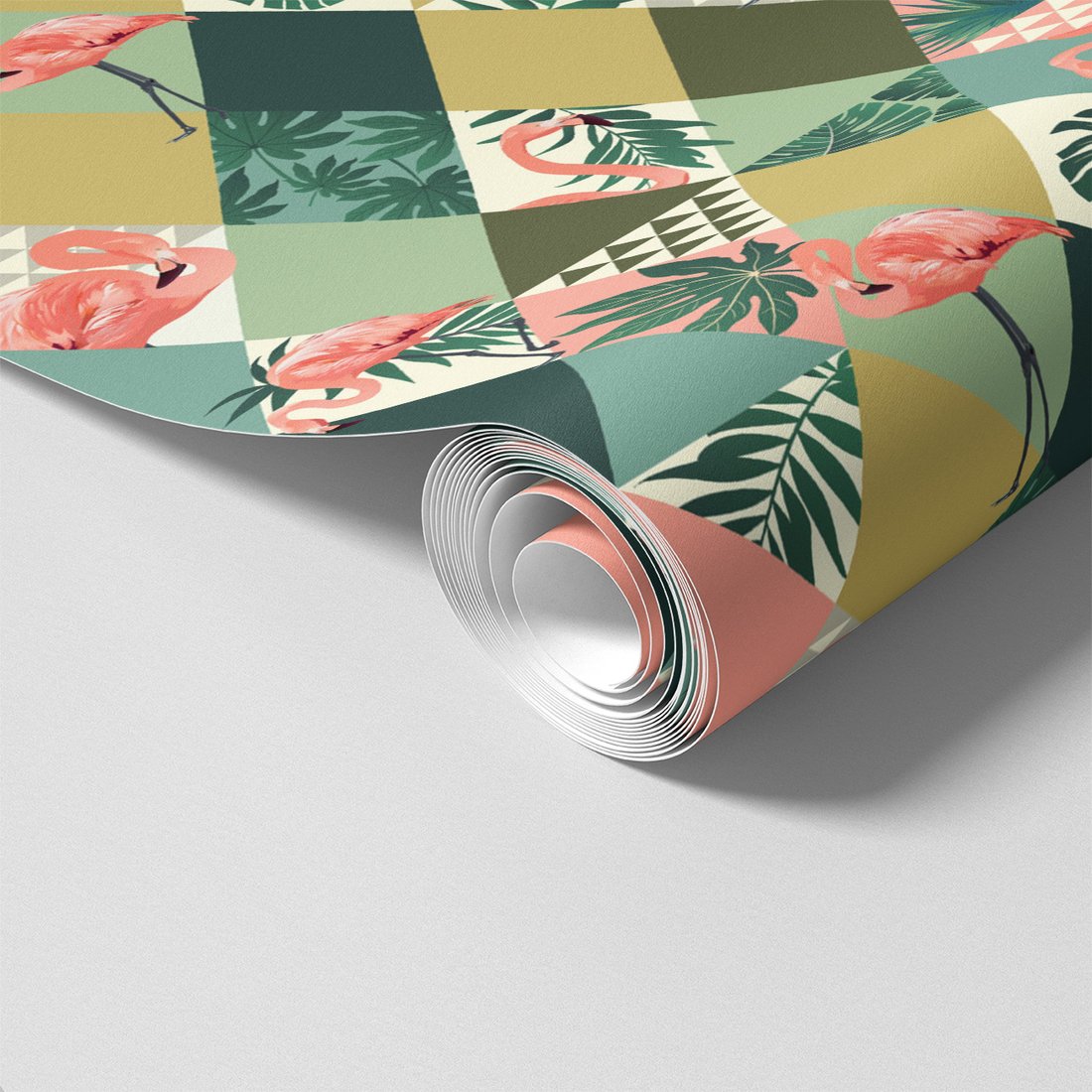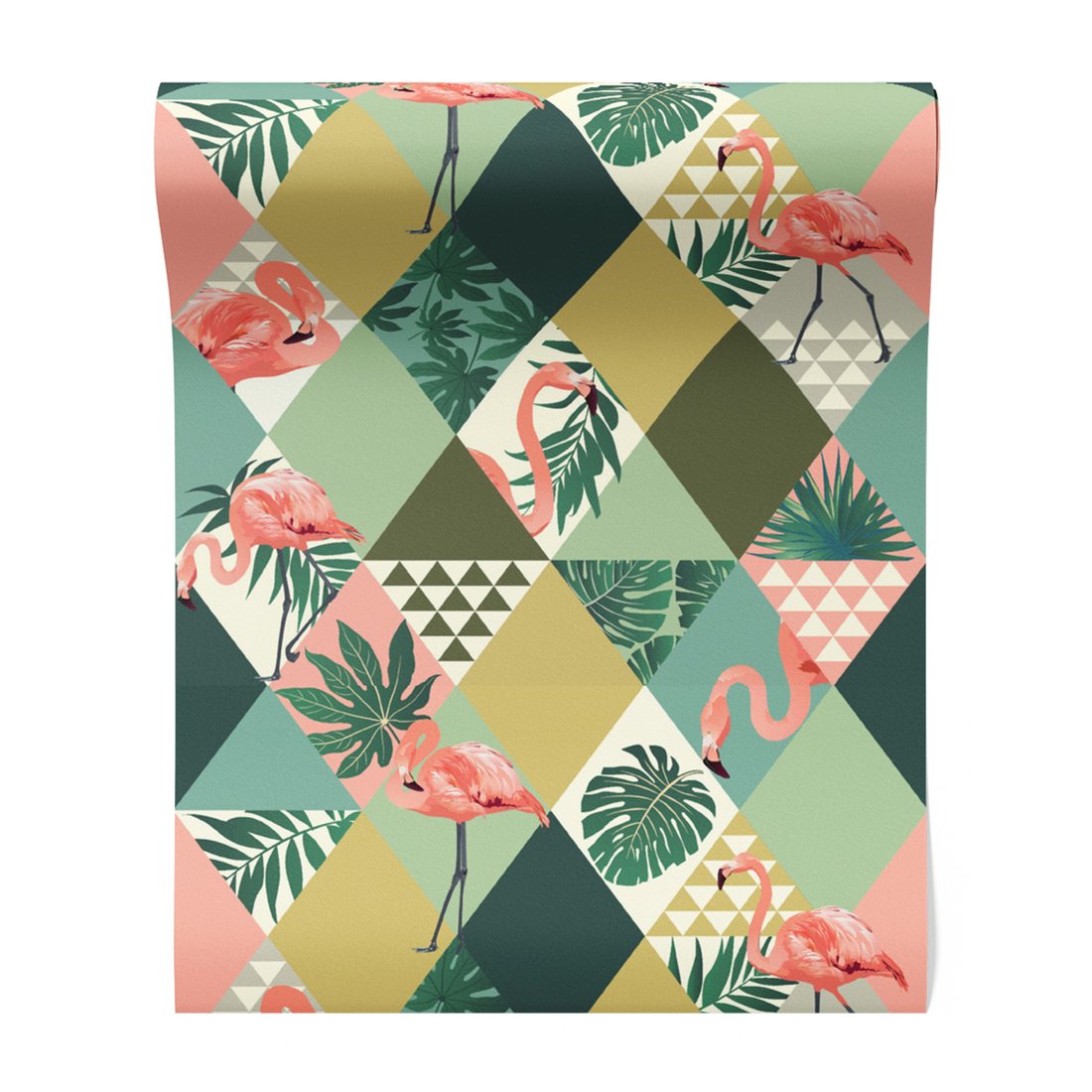 Odkryj piękno i funkcjonalność tapety z motywem flamingo, liście, trójkąty. To połączenie wyjątkowego wzornictwa z łatwością aplikacji, doskonałe do każdego pomieszczenia.