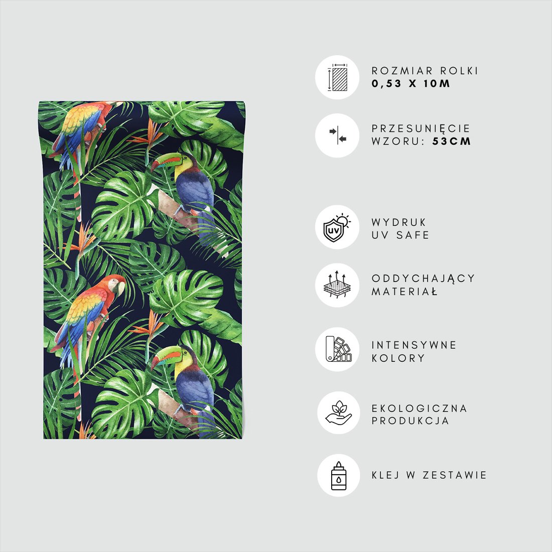 Odkryj piękno i funkcjonalność tapety z motywem liście, papuga, tukan. To połączenie wyjątkowego wzornictwa z łatwością aplikacji, doskonałe do każdego pomieszczenia.