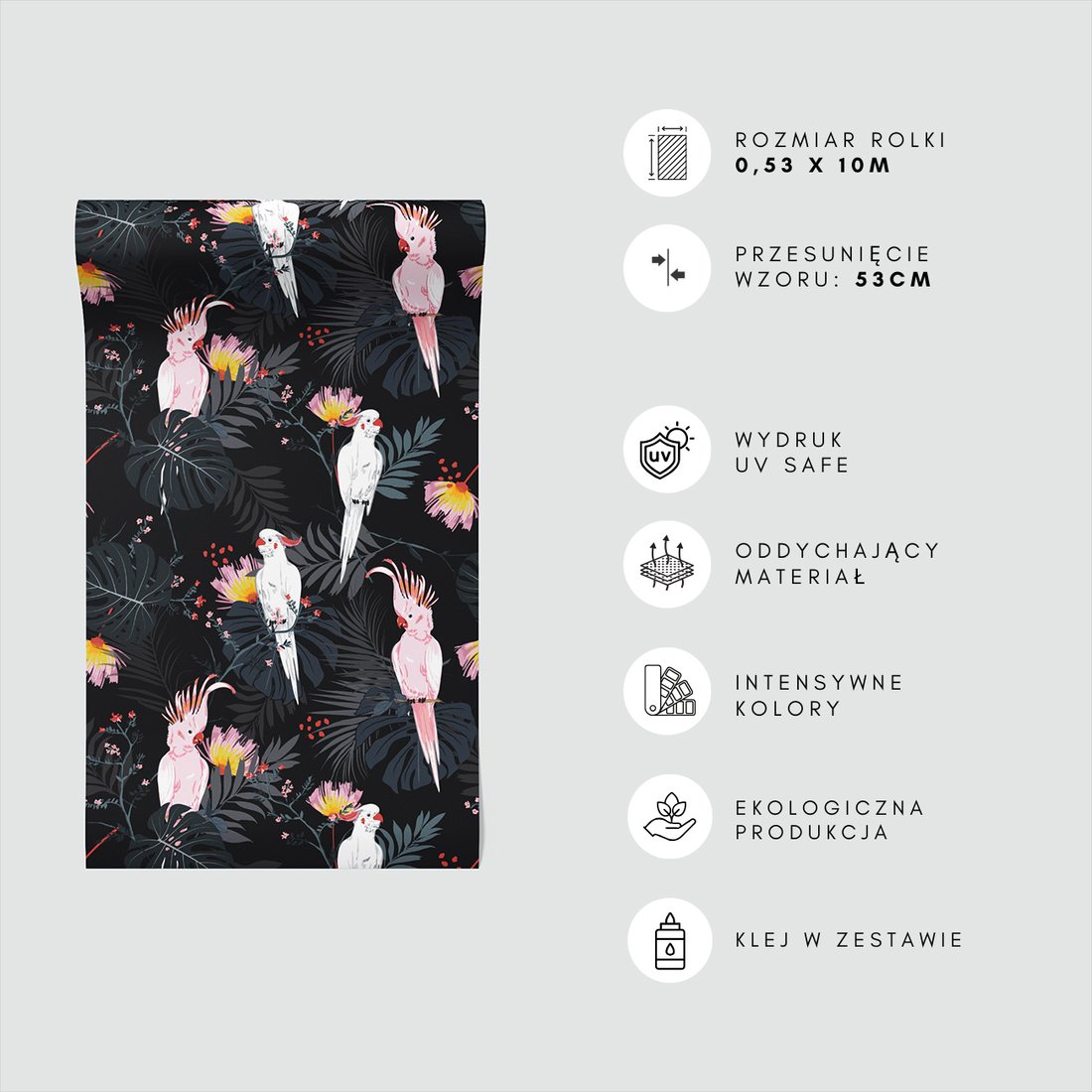 Odkryj piękno i funkcjonalność tapety z motywem liście, papugi, kwiaty. To połączenie wyjątkowego wzornictwa z łatwością aplikacji, doskonałe do każdego pomieszczenia.