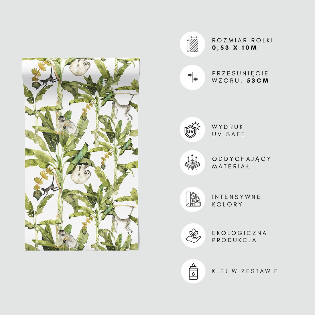 Odkryj piękno i funkcjonalność tapety z motywem małpy, leniwiec, liście. To połączenie wyjątkowego wzornictwa z łatwością aplikacji, doskonałe do każdego pomieszczenia.