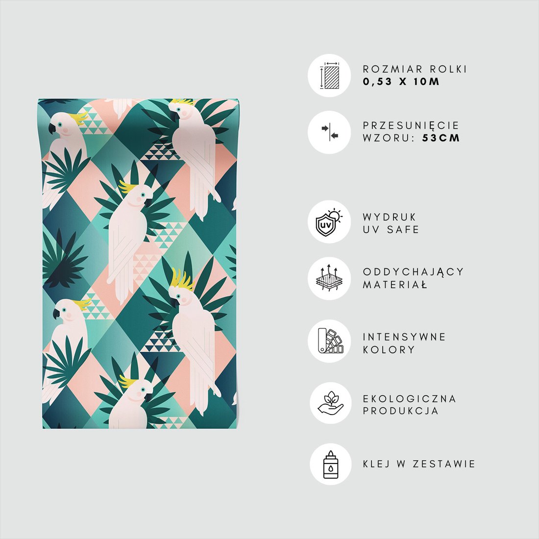 Odkryj piękno i funkcjonalność tapety z motywem papuga, liście, trójkąty. To połączenie wyjątkowego wzornictwa z łatwością aplikacji, doskonałe do każdego pomieszczenia.