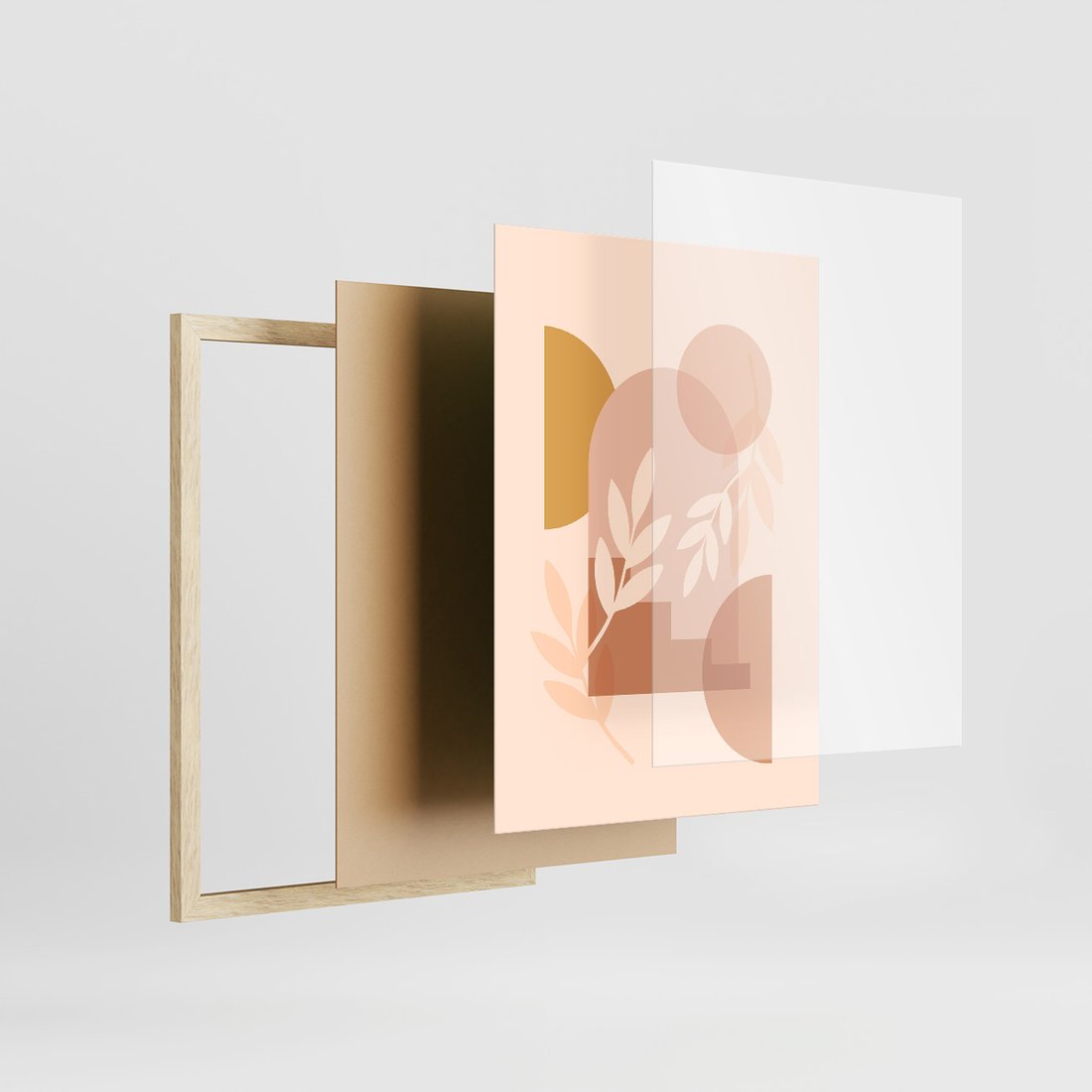 Zestaw obrazy w ramie, plakaty - abstrakcja, boho, liście - rama drewno