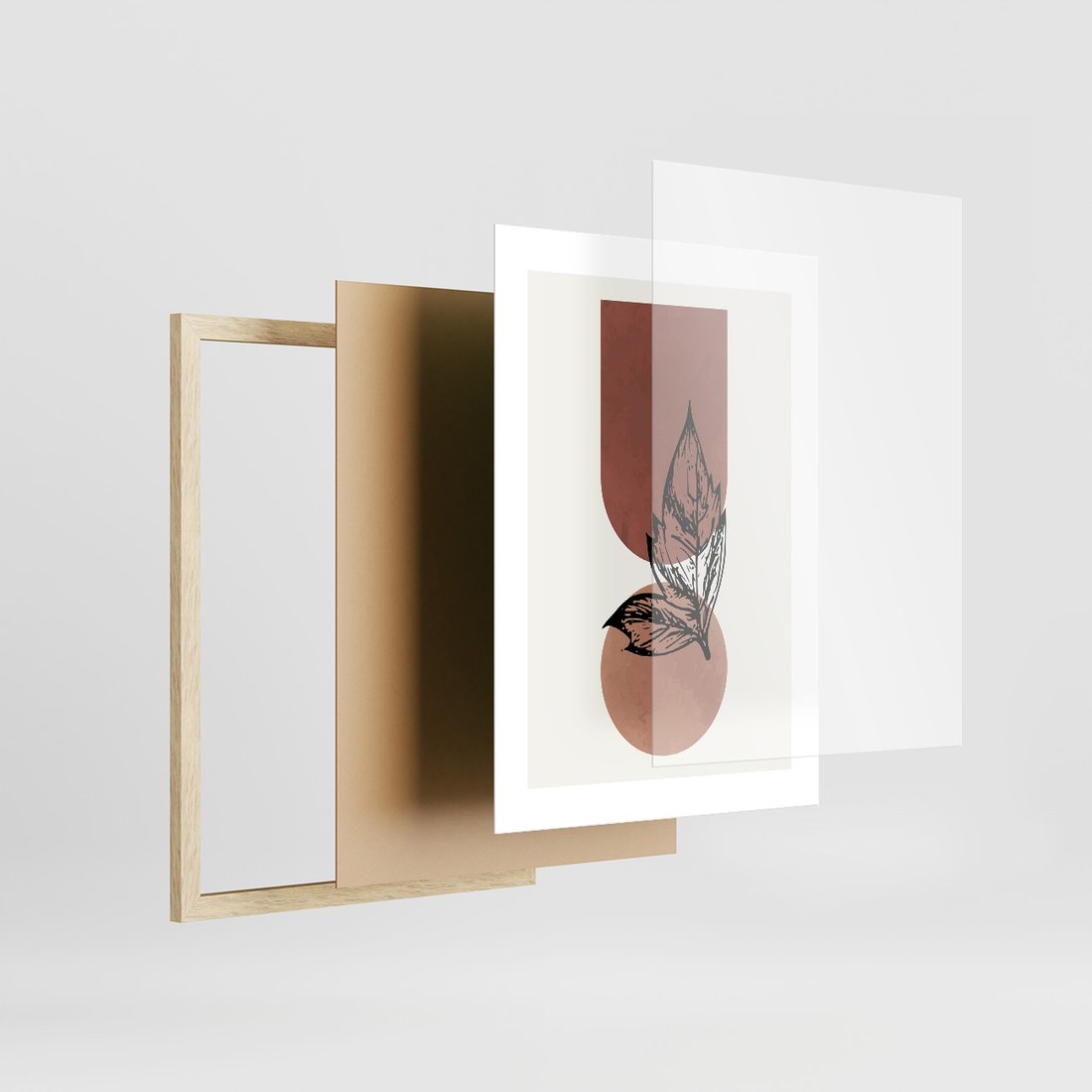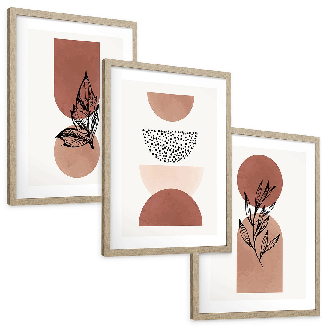 Zestaw obrazy w ramie, plakaty - abstrakcja, liście, kształty - rama drewno