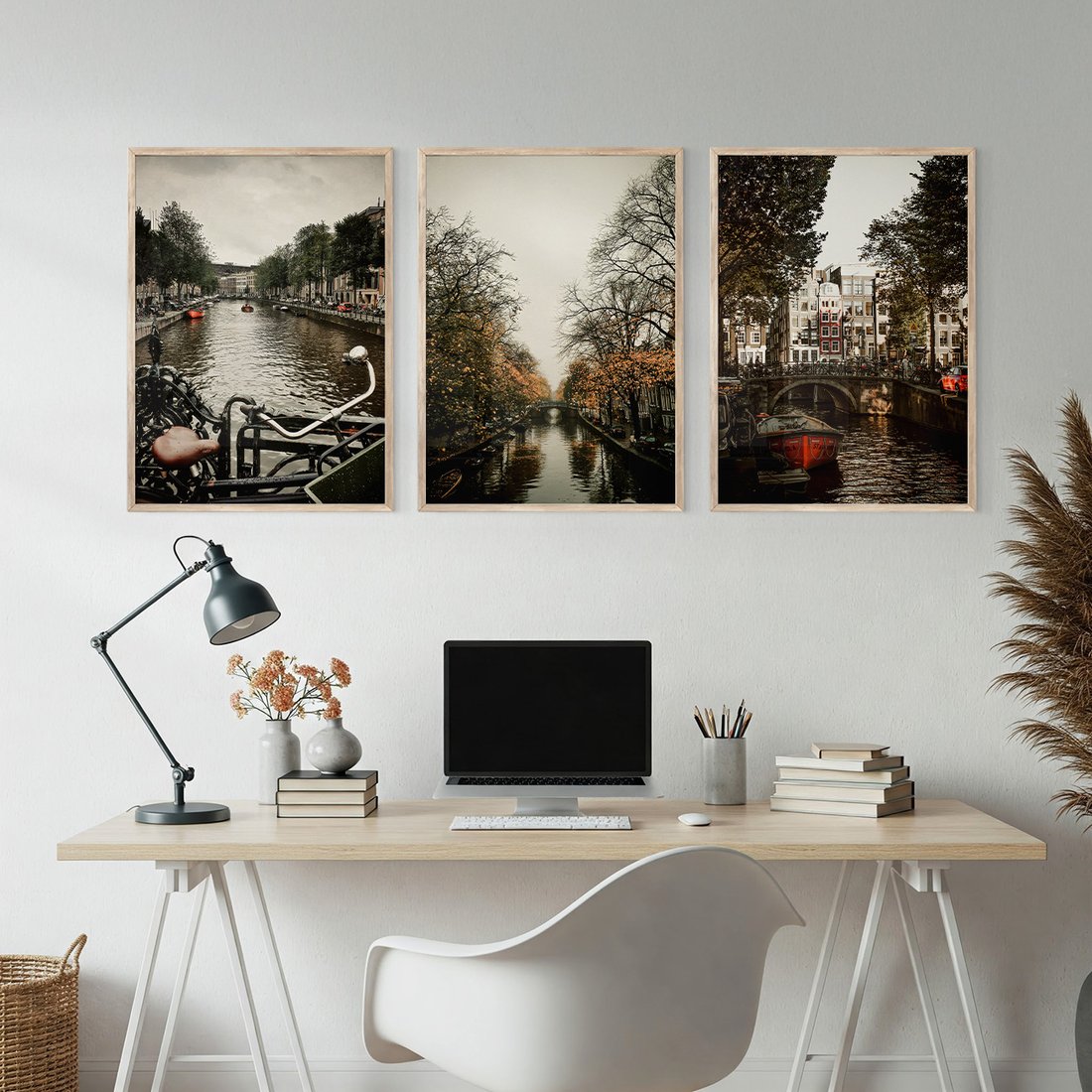 Zestaw obrazy w ramie, plakaty - Amsterdam, kanał, miasto - rama drewno