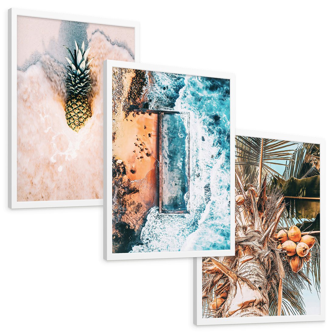 Zestaw obrazy w ramie, plakaty - ananas, plaża, kokosy - rama biała