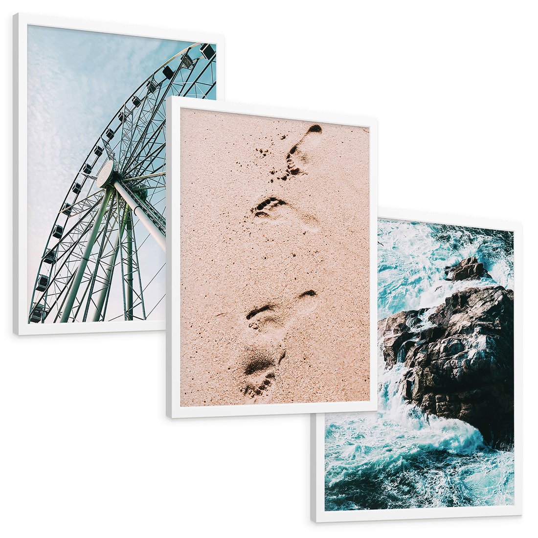 Zestaw obrazy w ramie, plakaty - atrakcje, piasek, morze - rama biała
