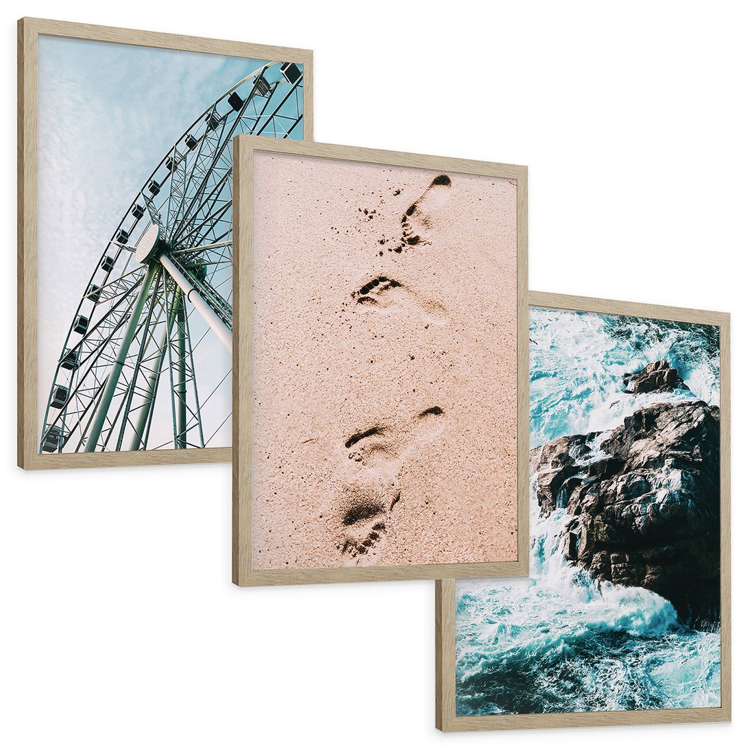 Zestaw obrazy w ramie, plakaty - atrakcje, piasek, morze - rama drewno