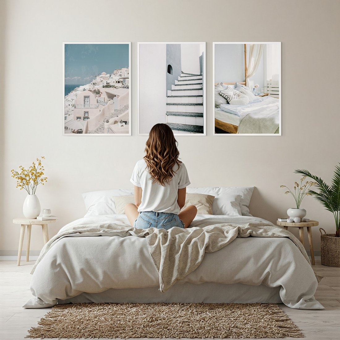 Zestaw obrazy w ramie, plakaty - budynki,schody,łóżko - rama biała