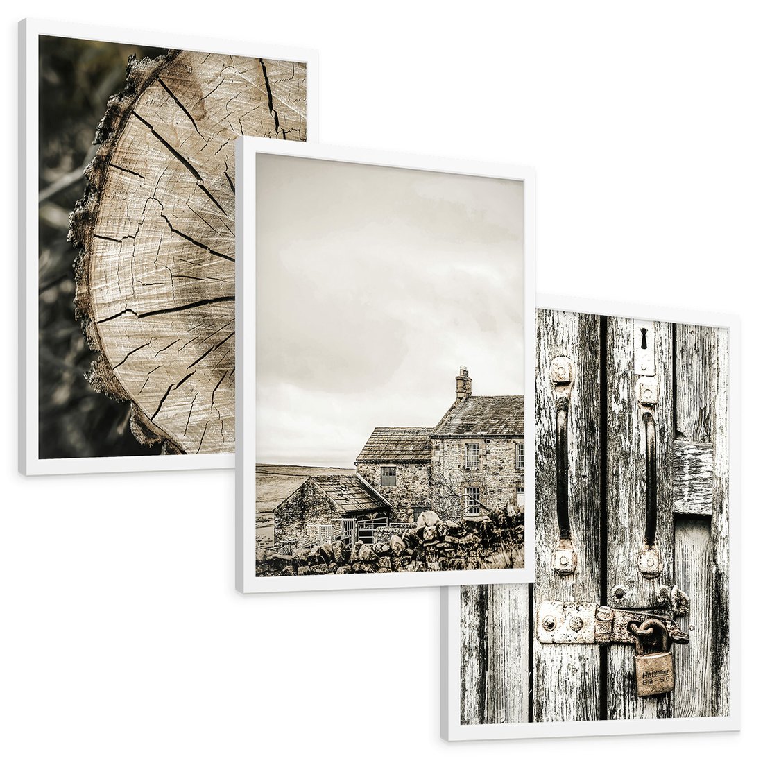 Zestaw obrazy w ramie, plakaty - drewno, tekstura, budynek - rama biała