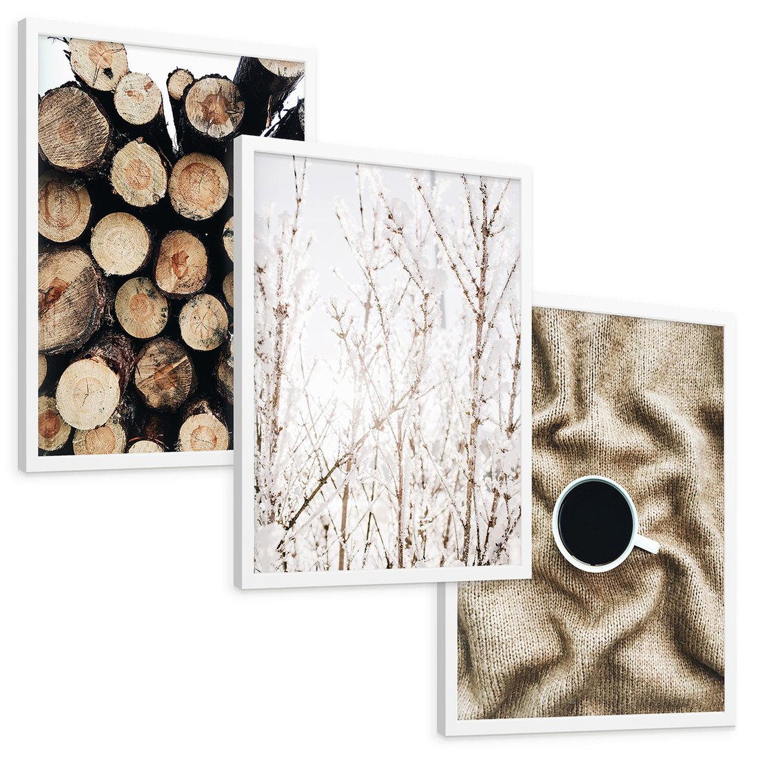 Zestaw obrazy w ramie, plakaty - drewno, zima, sweter - rama biała