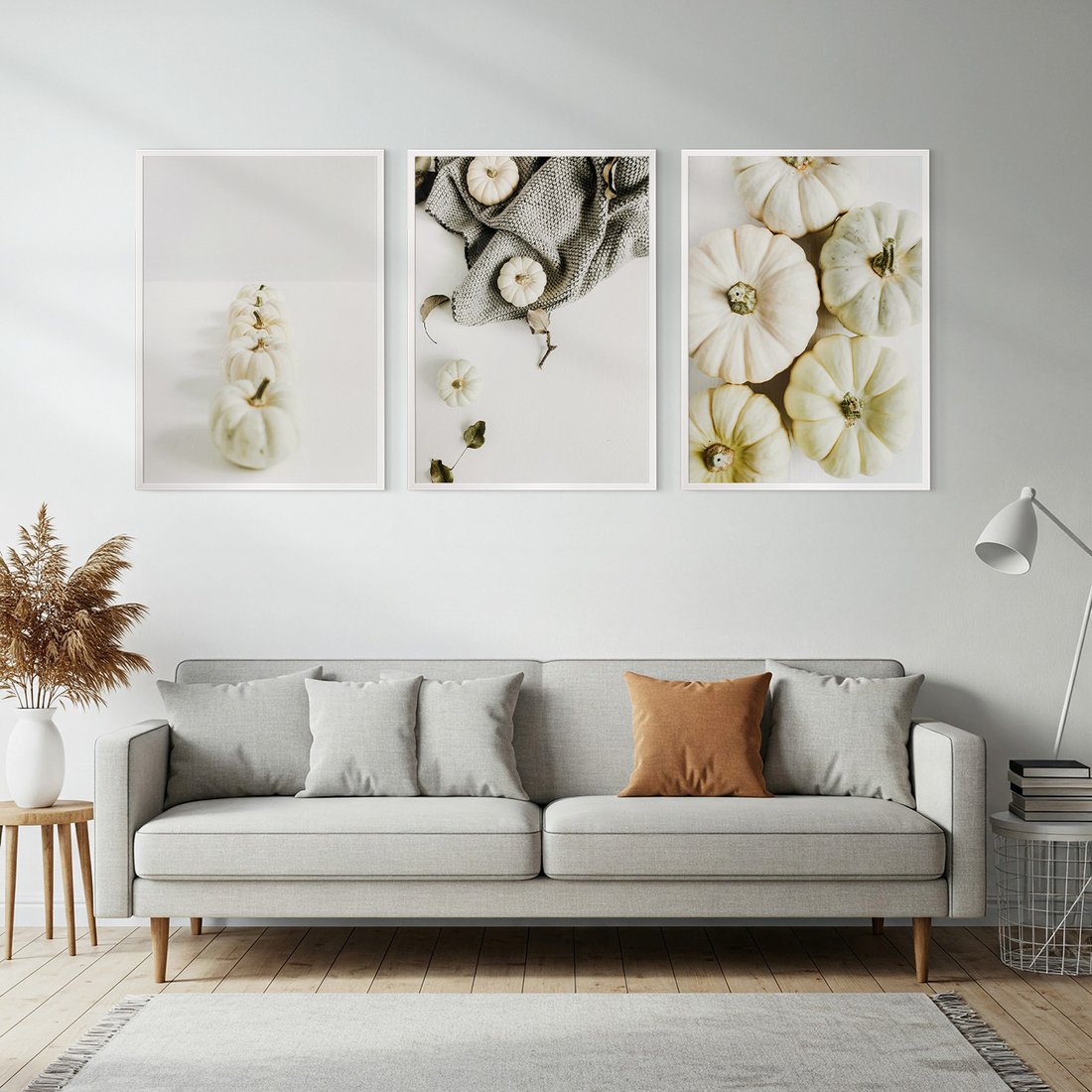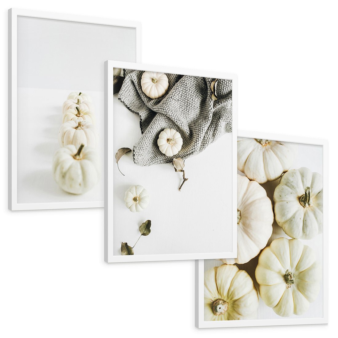 Zestaw obrazy w ramie, plakaty - dynie, jesień, dekoracje - rama biała