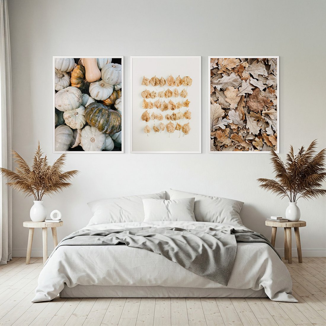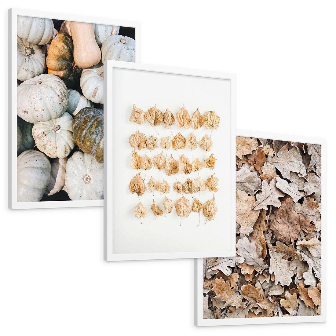 Zestaw obrazy w ramie, plakaty - dynie, liście, jesień - rama biała