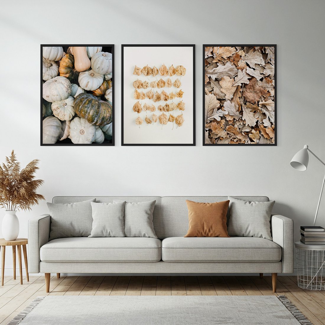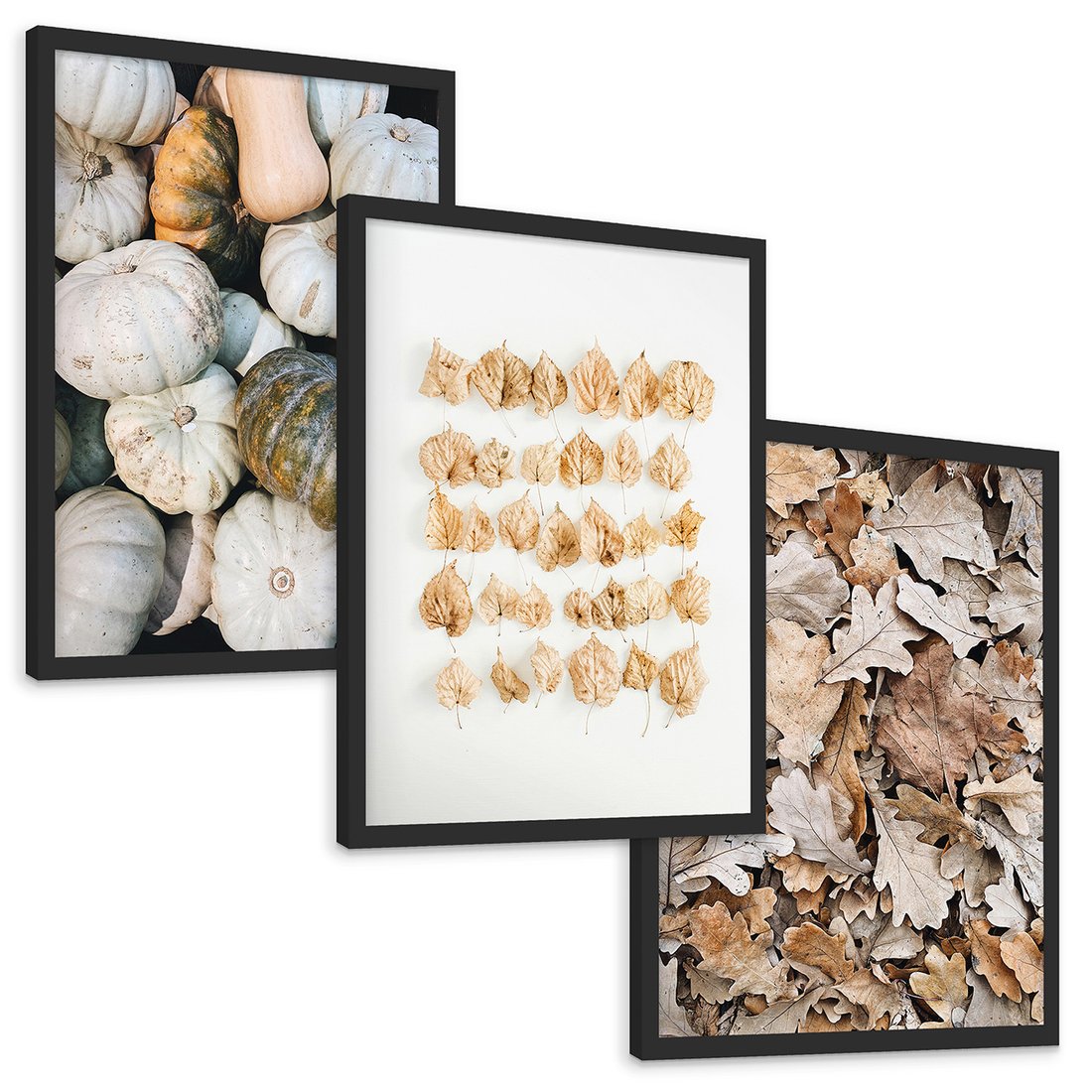 Zestaw obrazy w ramie, plakaty - dynie, liście, jesień - rama czarna