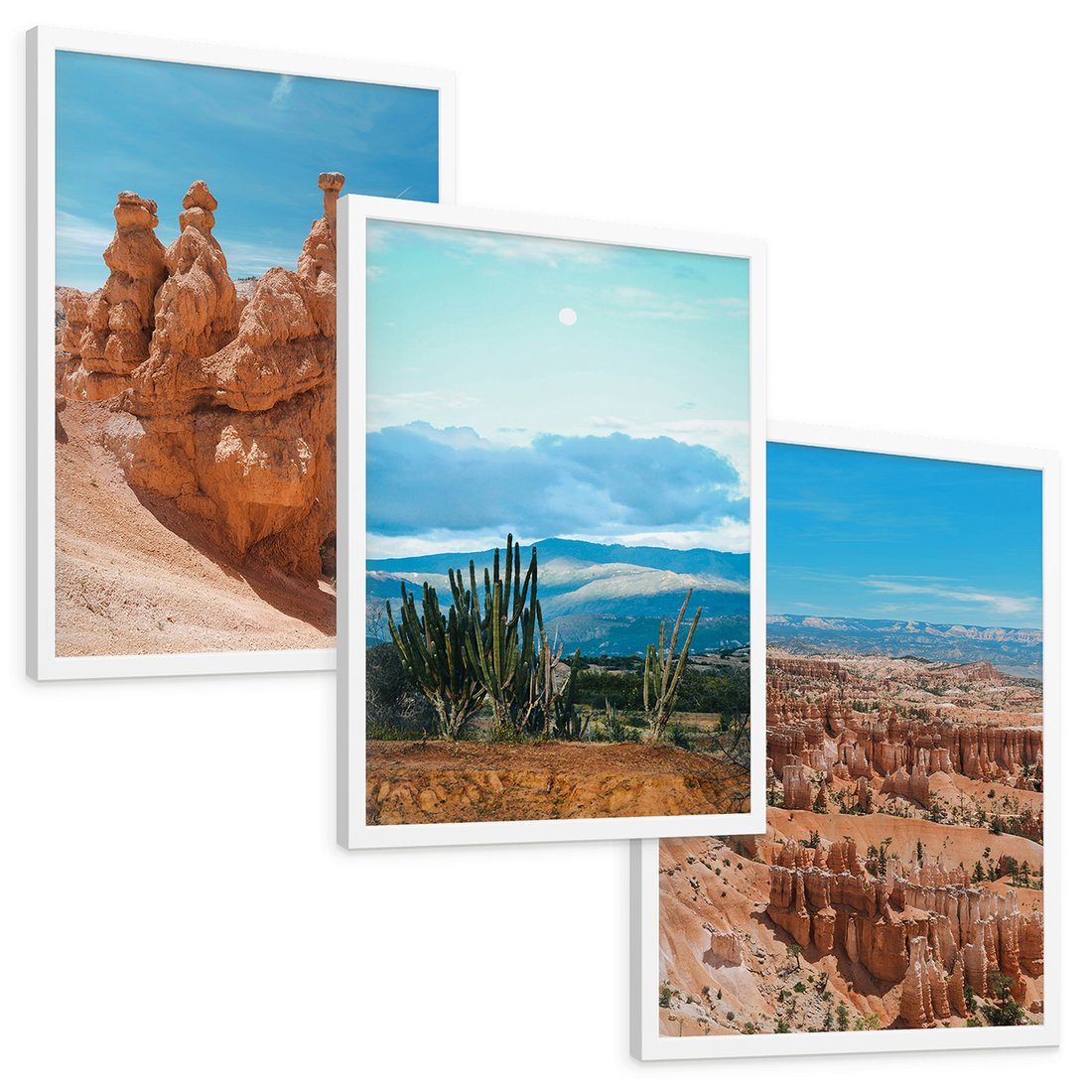 Zestaw obrazy w ramie, plakaty - formacje skalne, kanion, kaktusy - rama biała