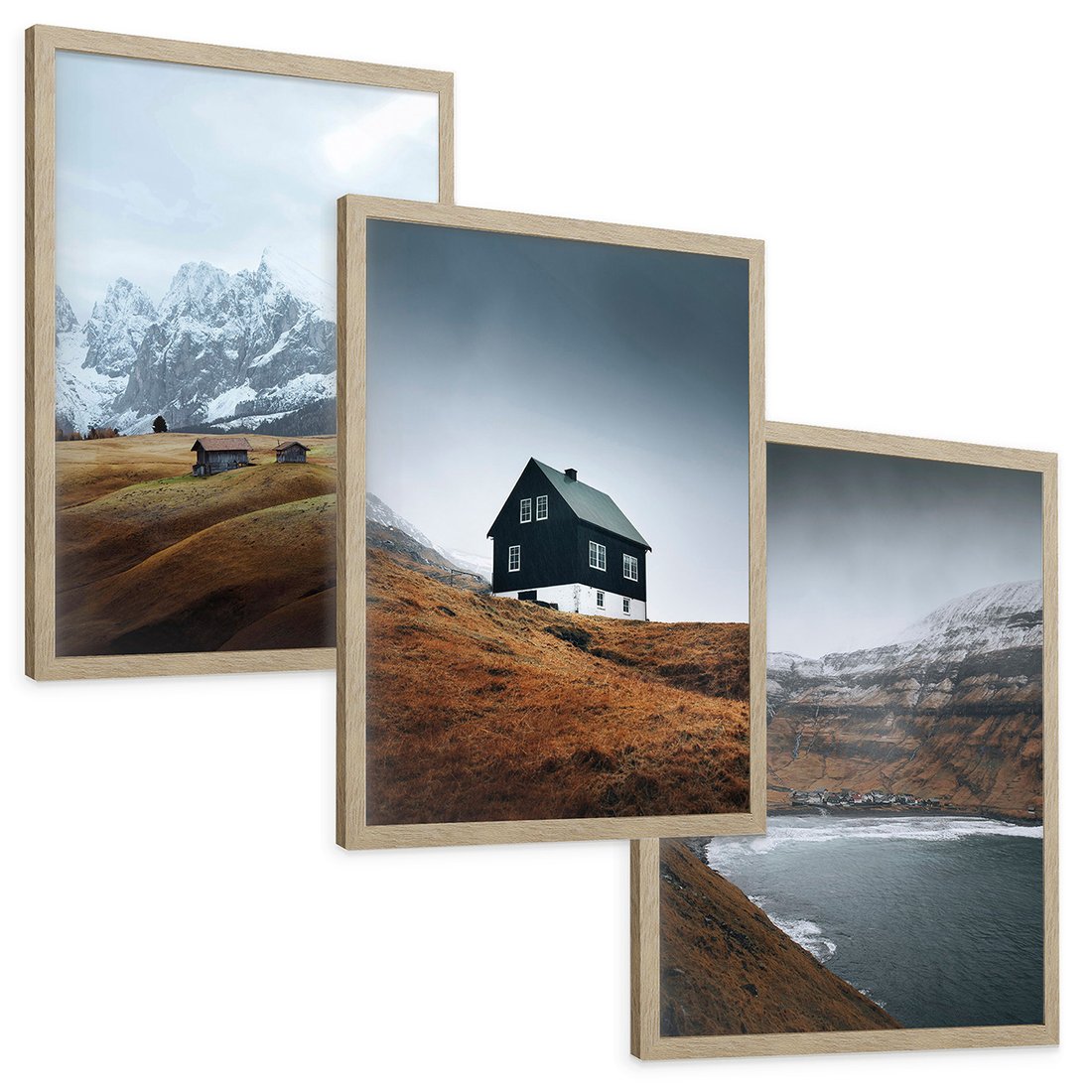 Zestaw obrazy w ramie, plakaty - góry, domy, krajobraz - rama drewno
