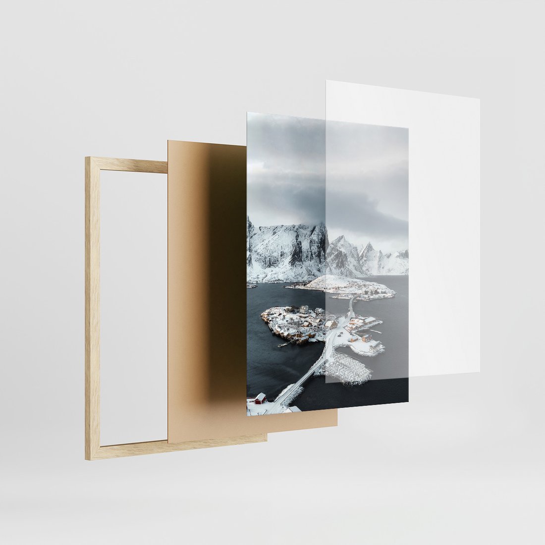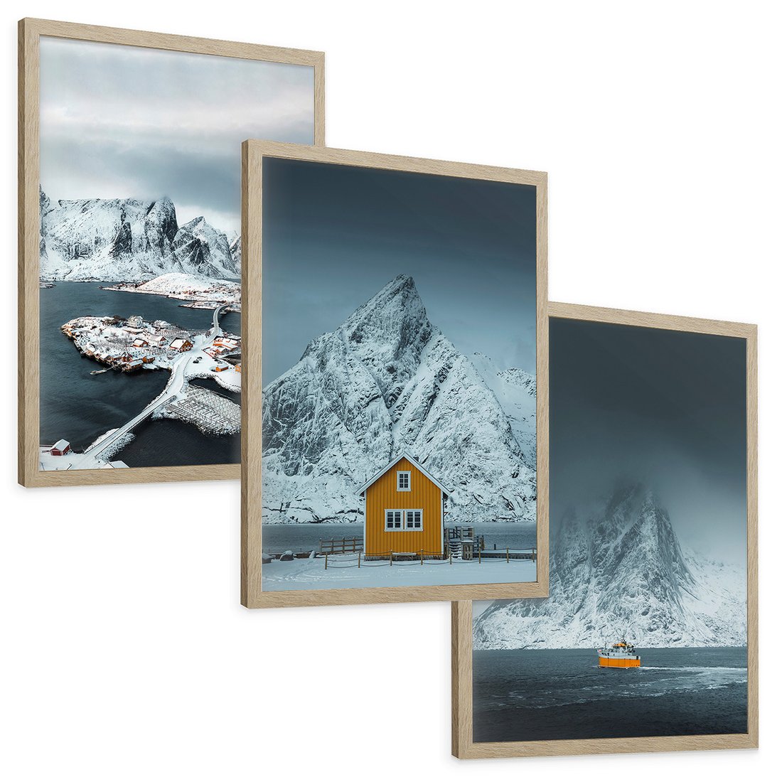 Zestaw obrazy w ramie, plakaty - góry, śnieg, woda - rama drewno