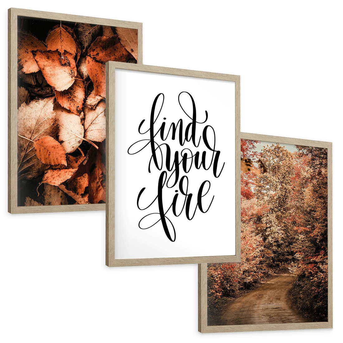 Zestaw obrazy w ramie, plakaty - jesień, liście, las - rama drewno