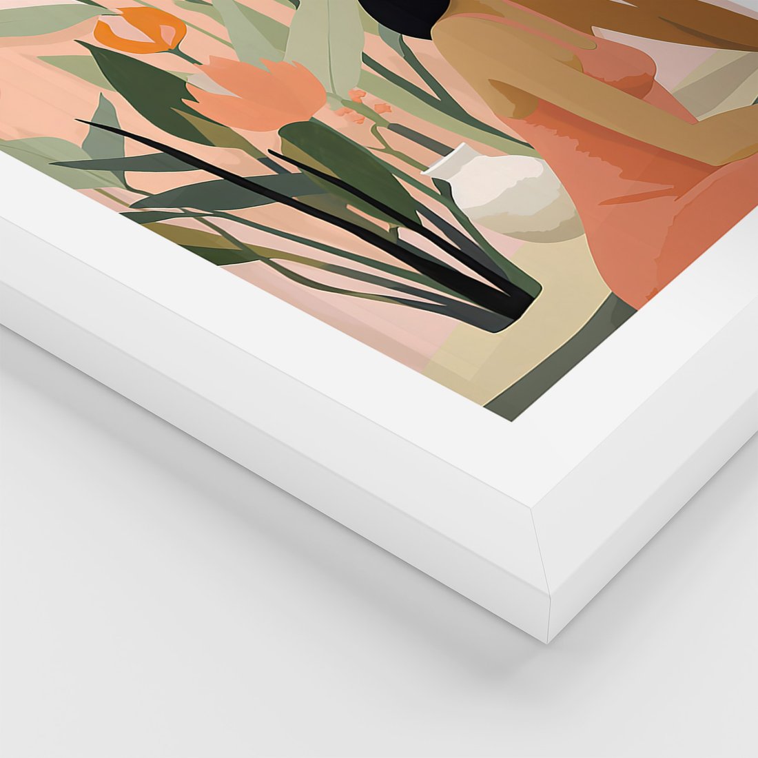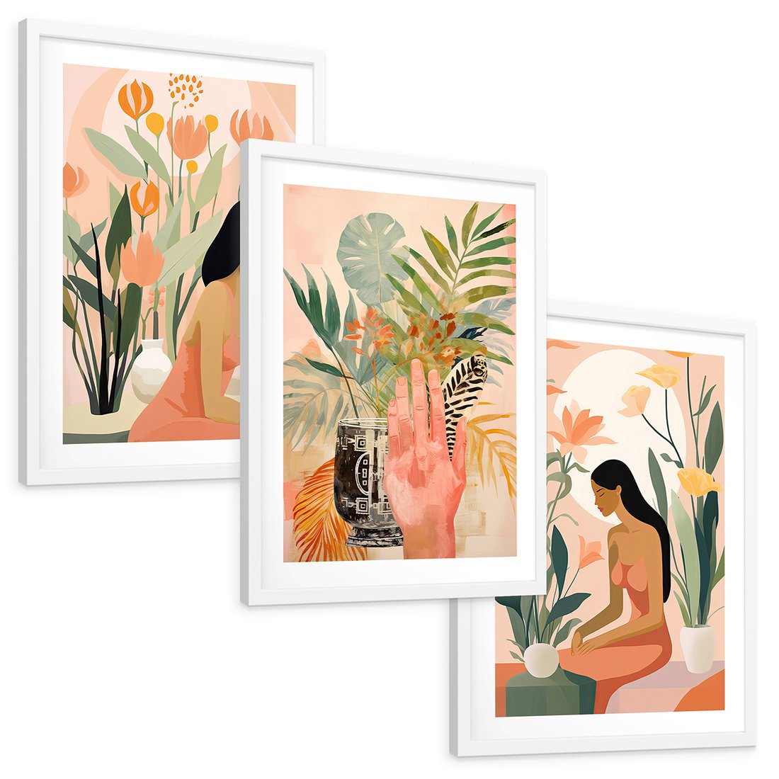 Zestaw obrazy w ramie, plakaty - kobieta, kwiaty, liście - rama biała