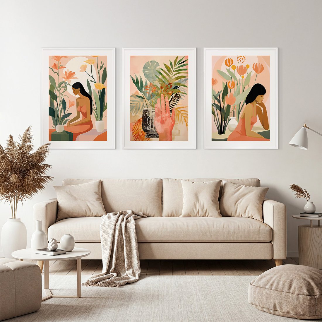• Zestaw obrazy w ramie, plakaty - kobieta, kwiaty, liście