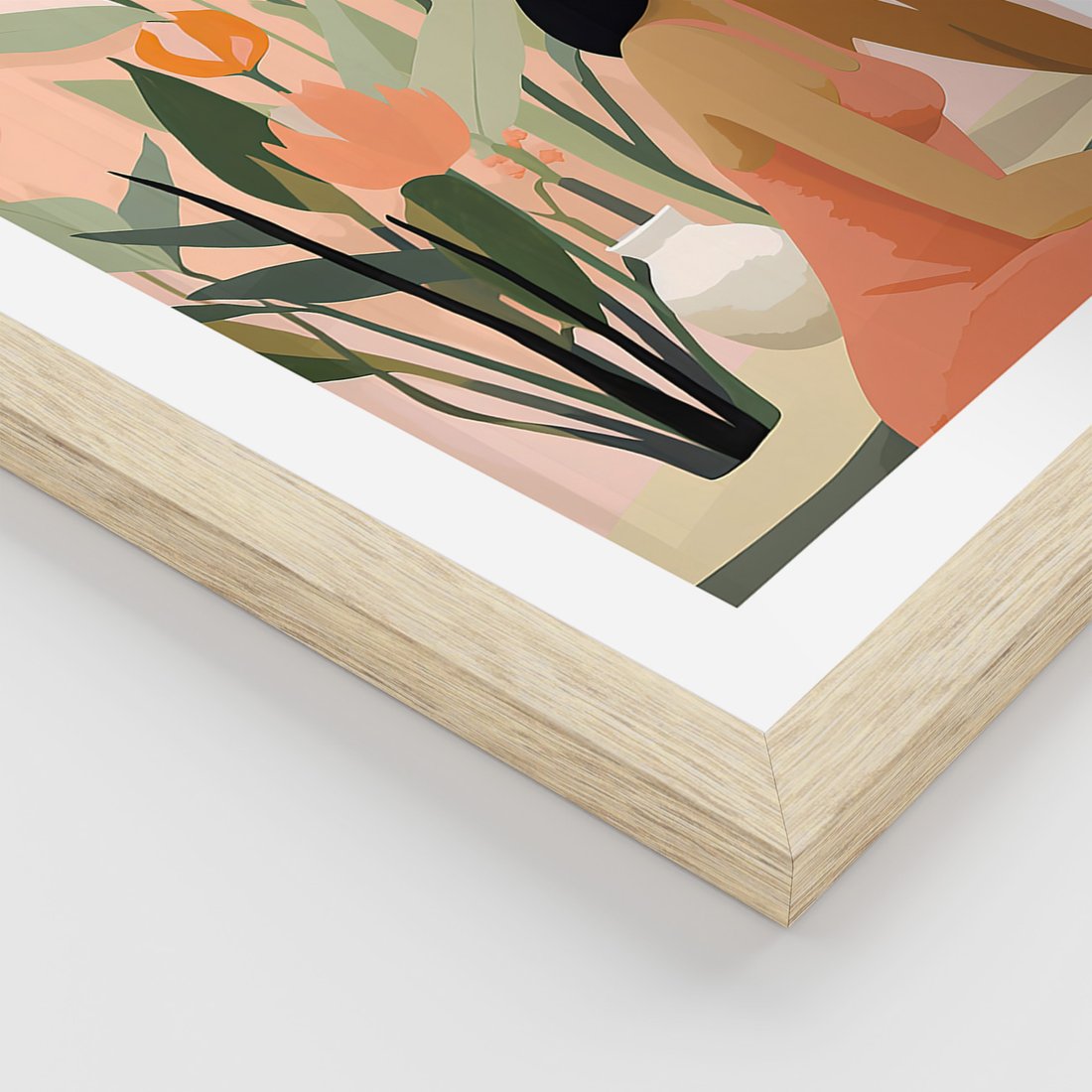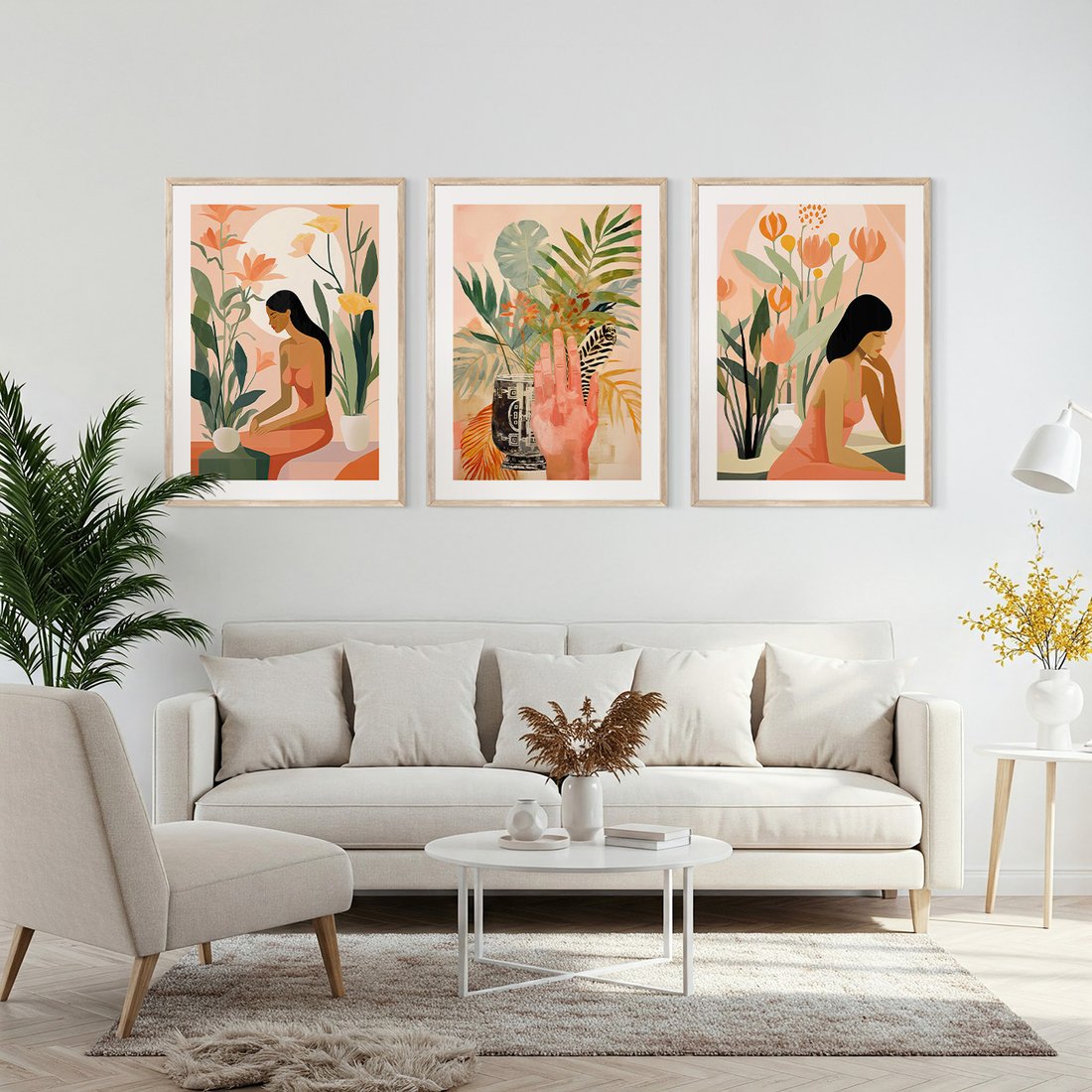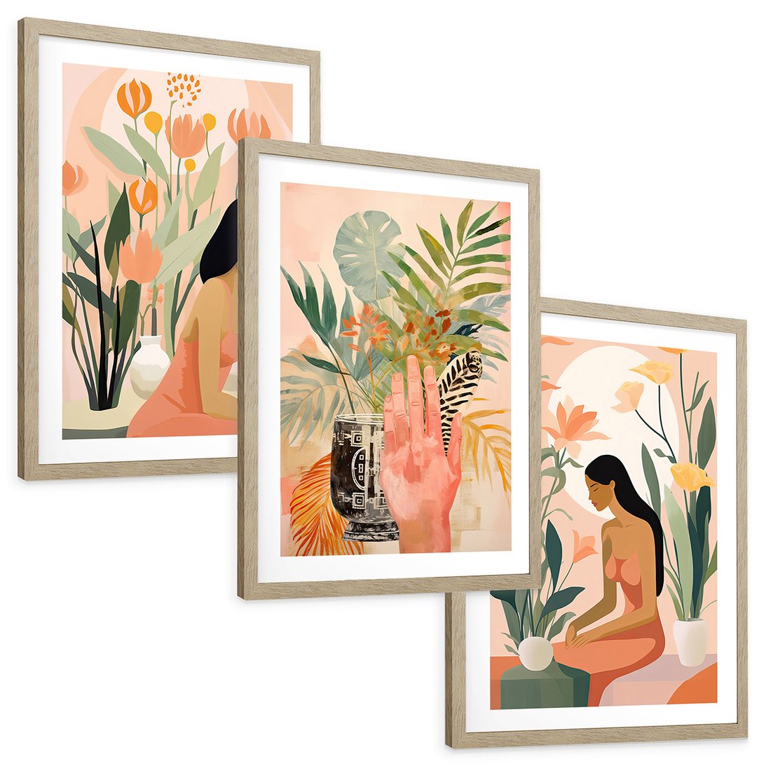 Zestaw obrazy w ramie, plakaty - kobieta, kwiaty, liście - rama drewno