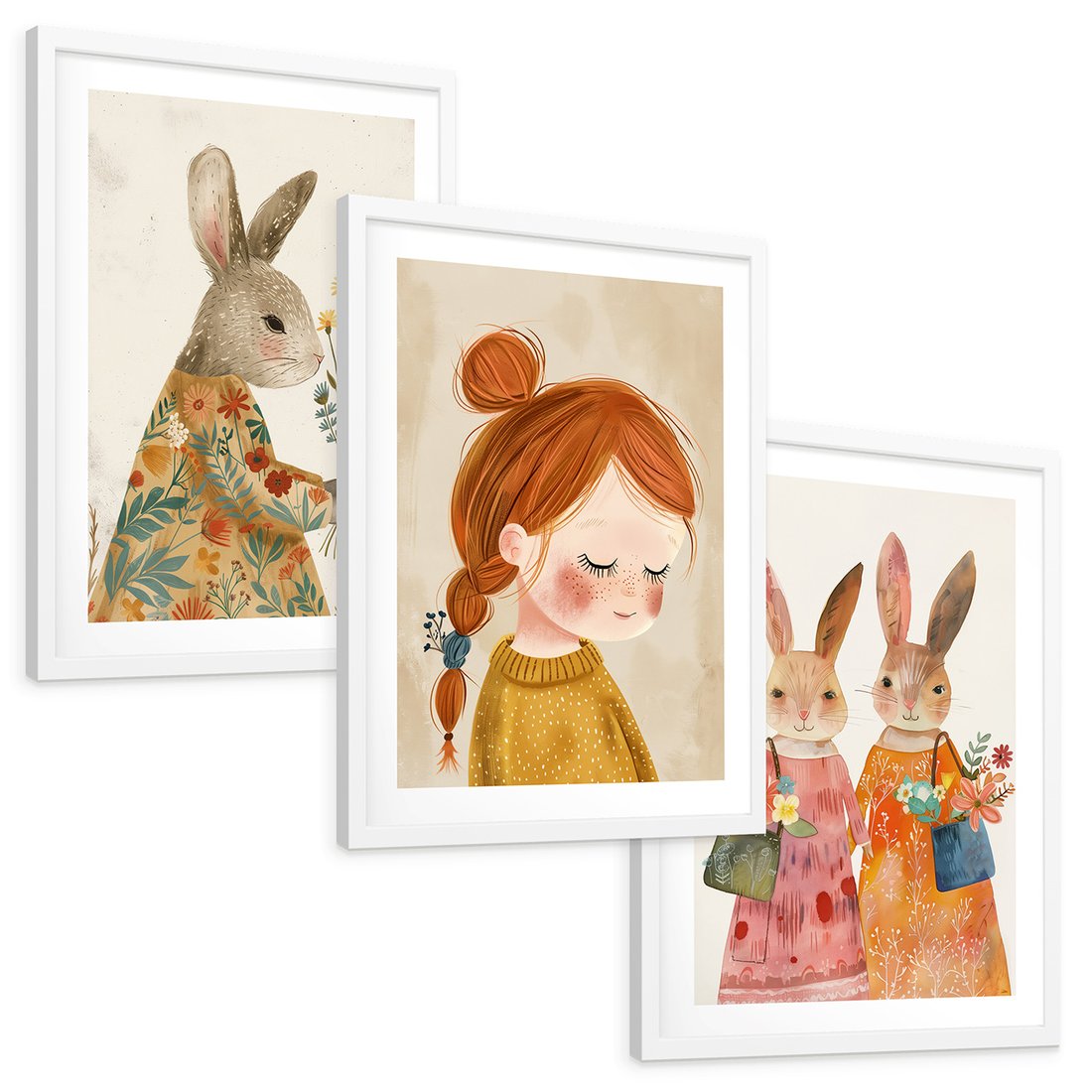 - Zestaw obrazy w ramie, plakaty - króliki, dziewczynka, kwiaty