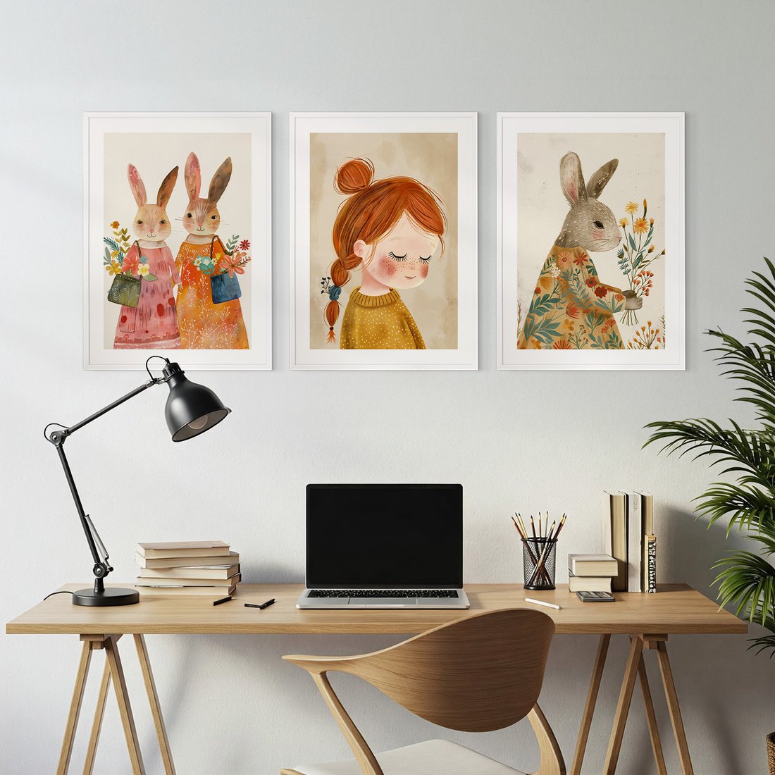 Przenieś piękno sztuki do swojego domu dzięki naszemu starannie skomponowanemu produktowi zestaw obrazów króliki, dziewczynka, kwiaty. Każdy plakat, oprawiony w elegancką ramę, łączy w sobie estetykę i trwałość. Uniwersalne wzornictwo sprawia, że te dekoracje ścienne doskonale komponują się z różnymi stylami wnętrz, od nowoczesnych po klasyczne. Łatwość montażu pozwala na szybką i bezproblemową metamorfozę Twojej przestrzeni. To również idealny pomysł na wyszukany prezent, który z pewnością zachwyci.