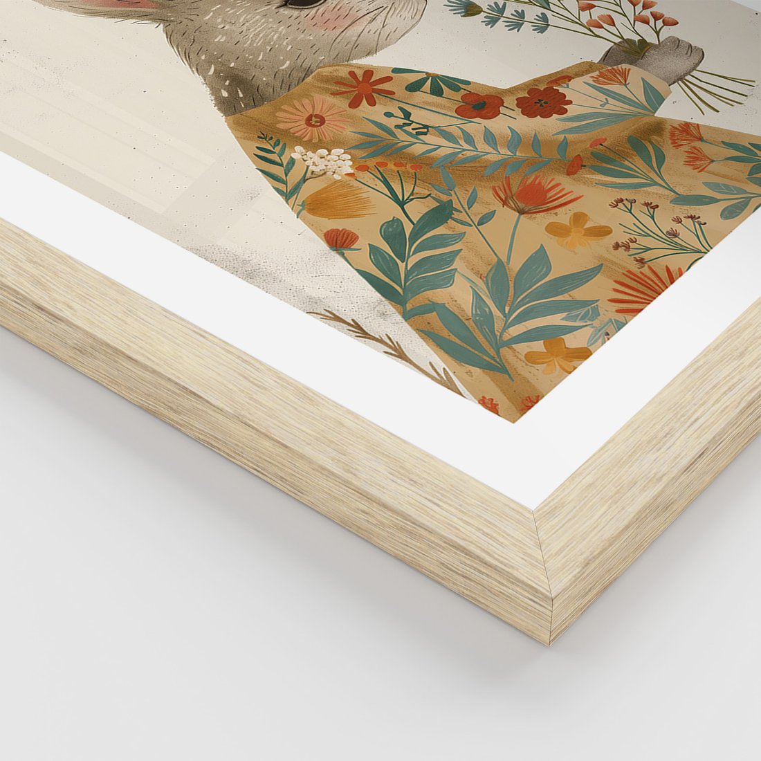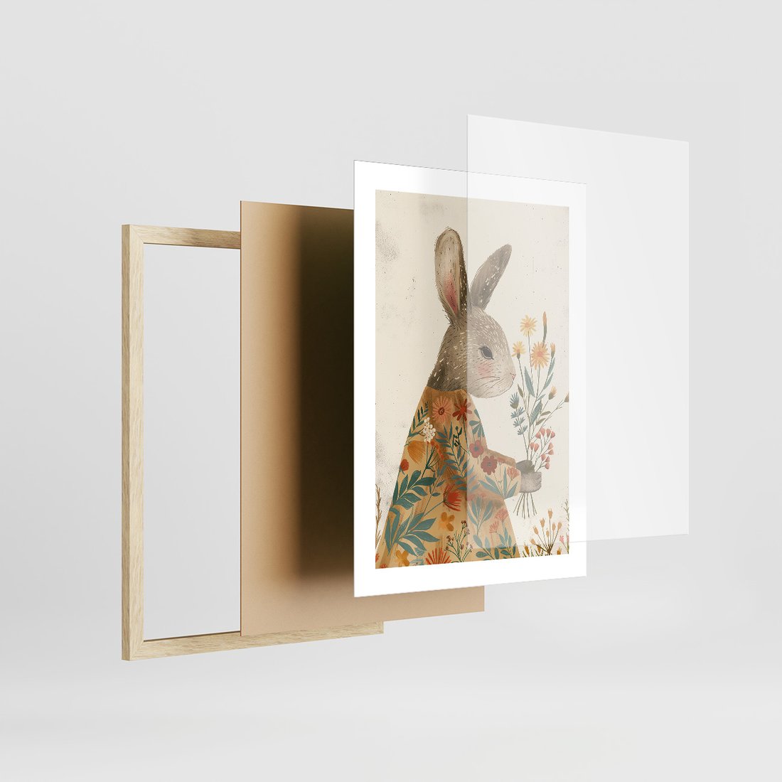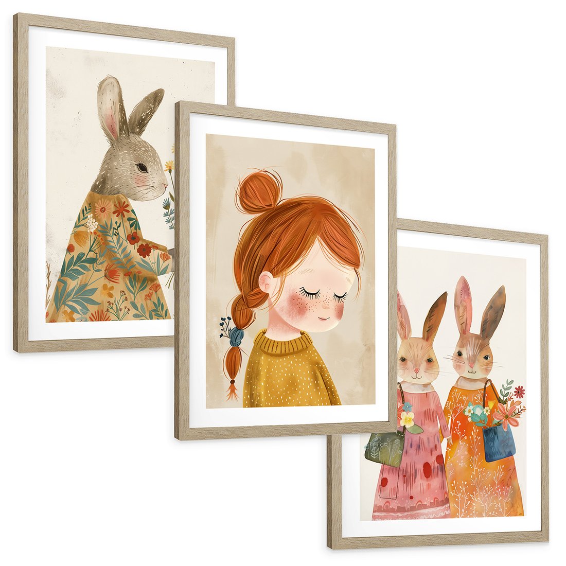 Zestaw obrazy w ramie, plakaty - króliki, dziewczynka, kwiaty - rama drewno