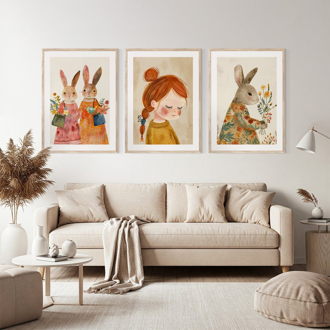 - Zestaw obrazy w ramie, plakaty - króliki, dziewczynka, kwiaty