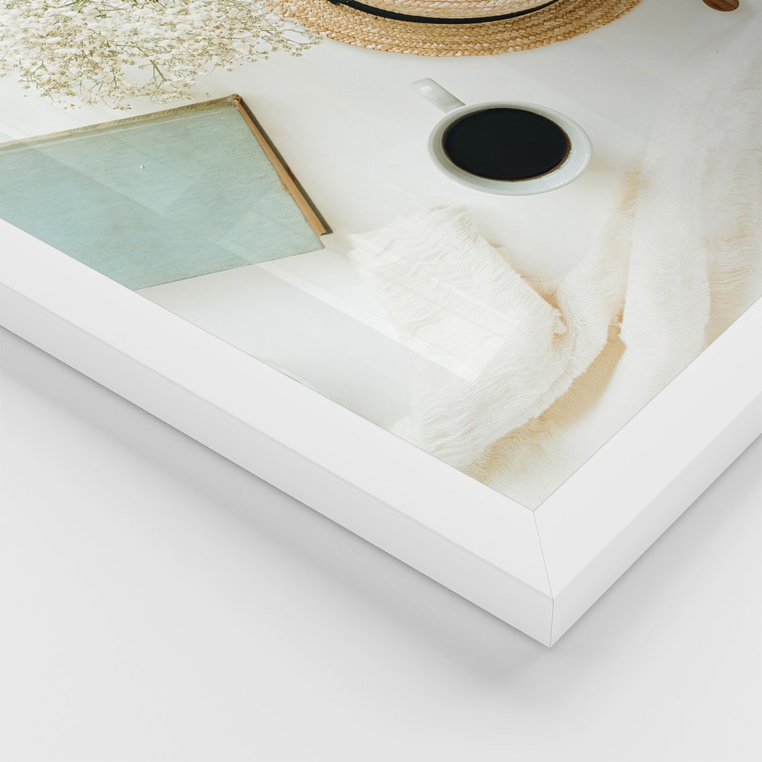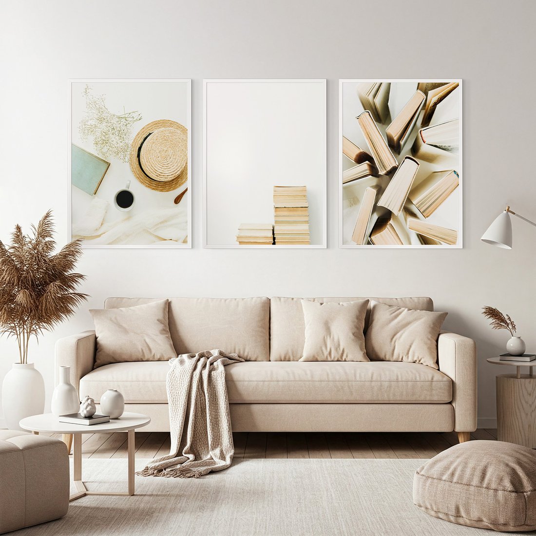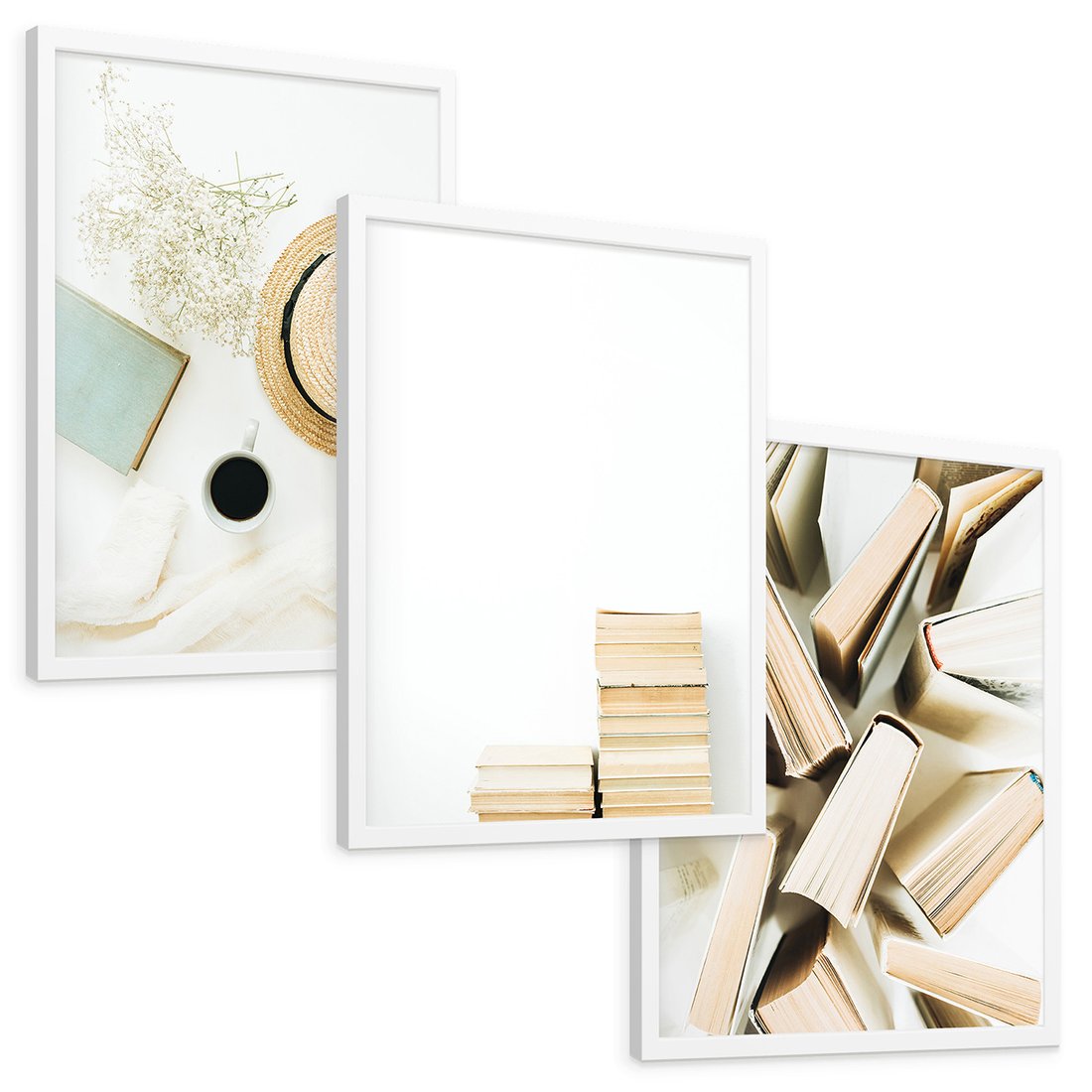 Zestaw obrazy w ramie, plakaty - książki, kapelusz, kwiaty - rama biała