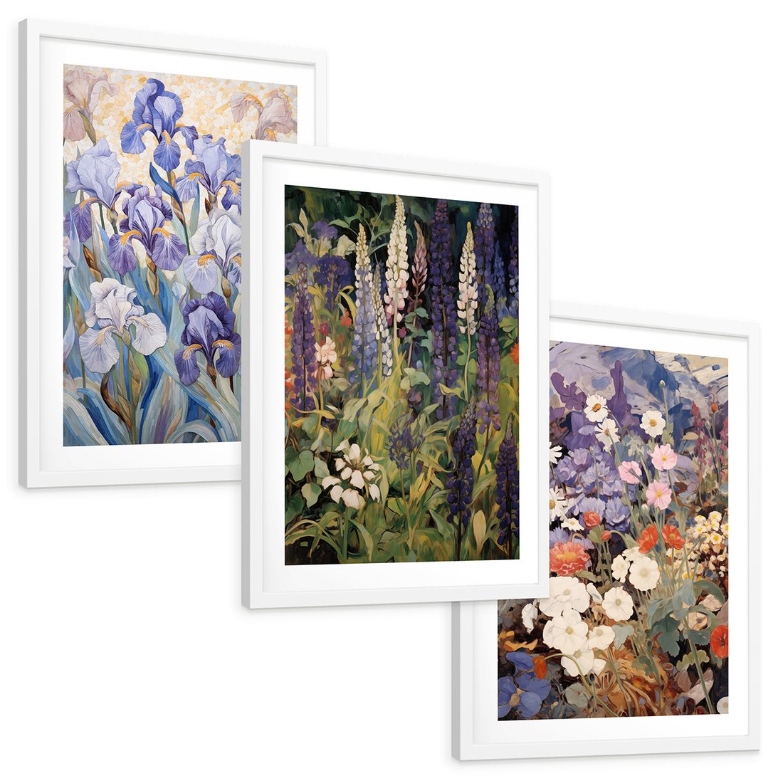 Zestaw obrazy w ramie, plakaty - kwiaty, irysy, rośliny - rama biała