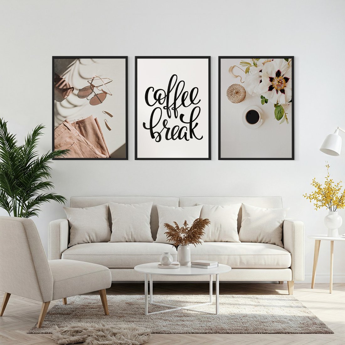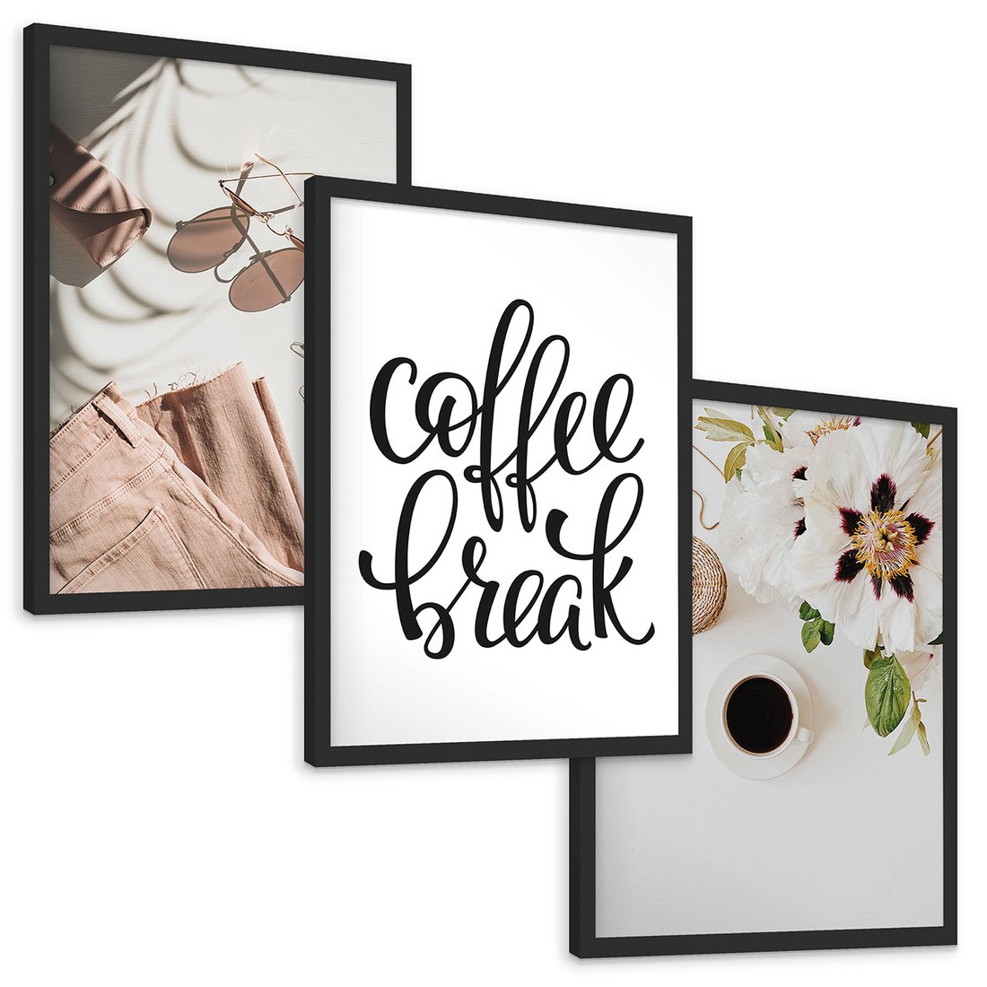 Zestaw obrazy w ramie, plakaty - kwiaty, kawa, akcesoria - rama czarna