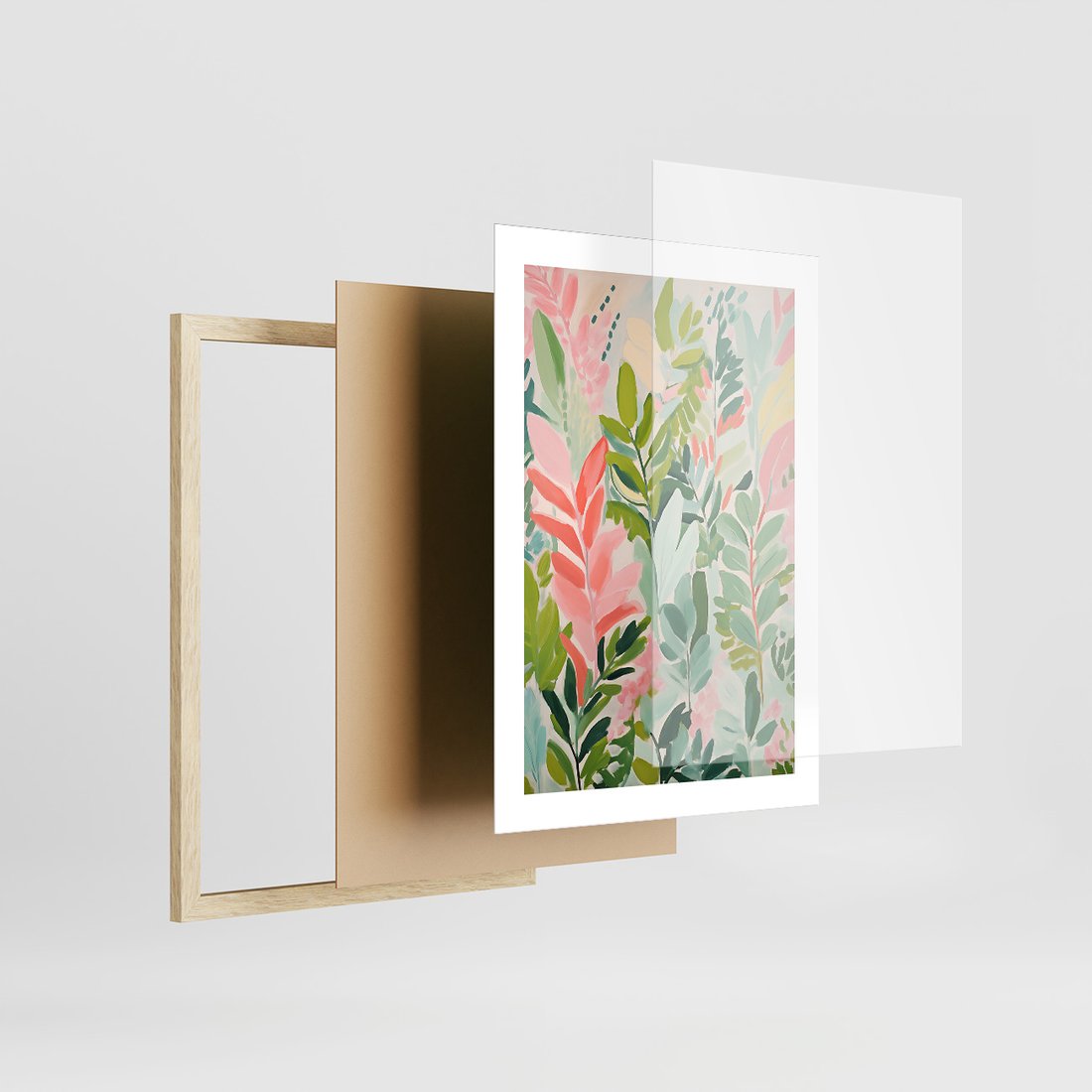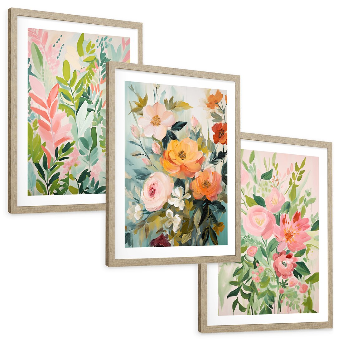 Zestaw obrazy w ramie, plakaty - kwiaty, liście, rośliny - rama drewno