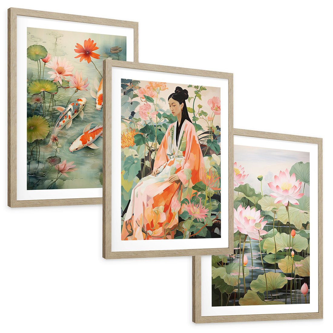 Zestaw obrazy w ramie, plakaty - kwiaty lotosu, ryby koi, azjatycka kobieta - rama drewno