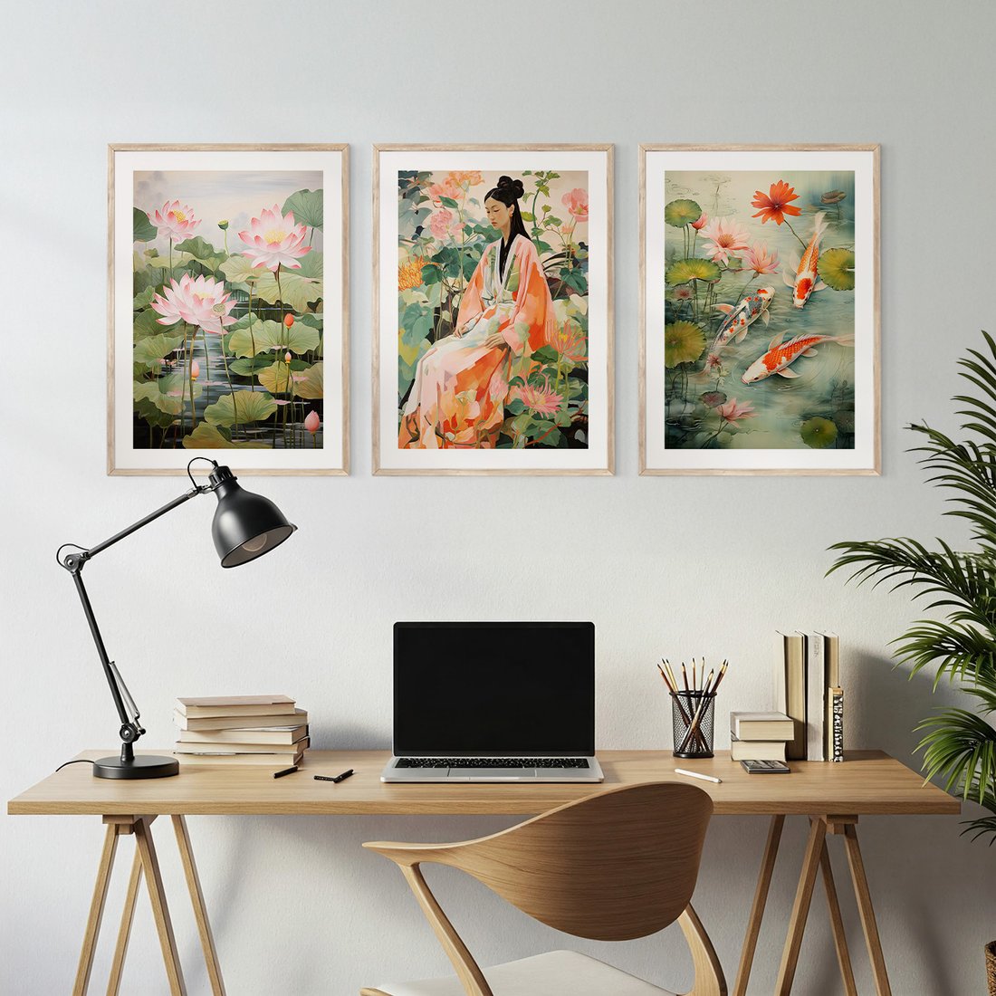 - Zestaw obrazy w ramie, plakaty - kwiaty lotosu, ryby koi, azjatycka kobieta