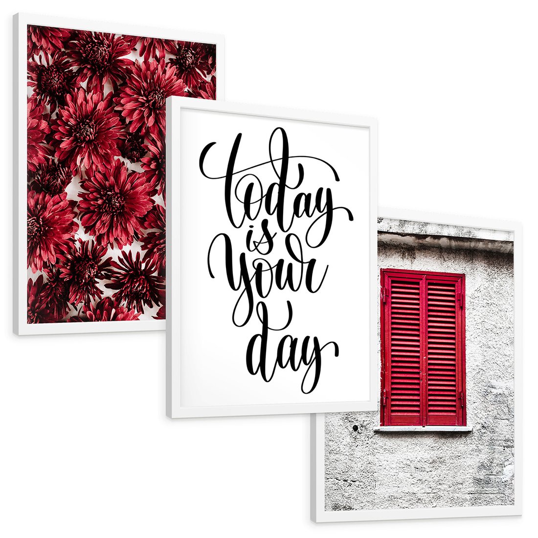 Zestaw obrazy w ramie, plakaty - kwiaty, okno, typografia - rama biała