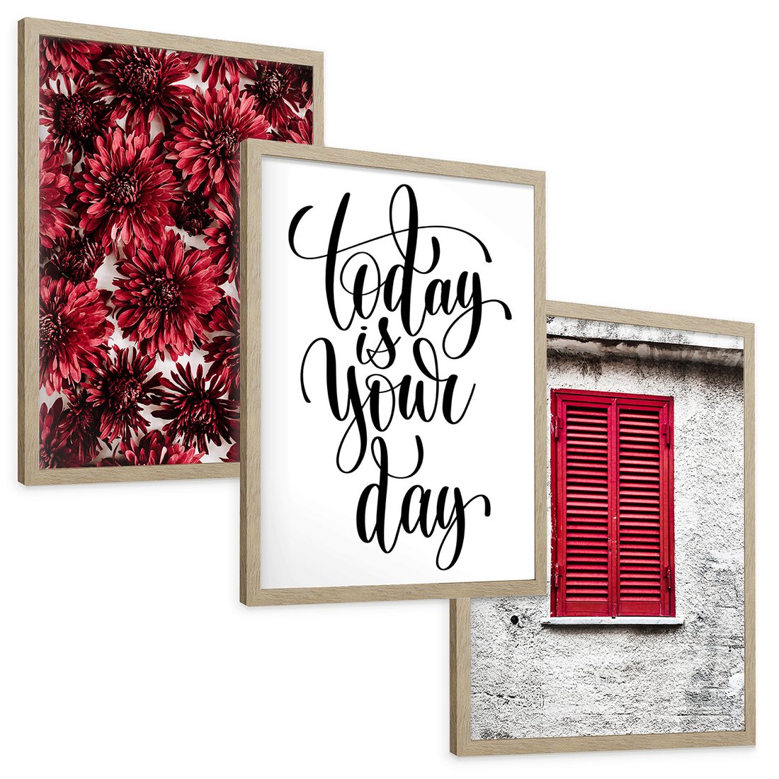 Zestaw obrazy w ramie, plakaty - kwiaty, okno, typografia - rama drewno