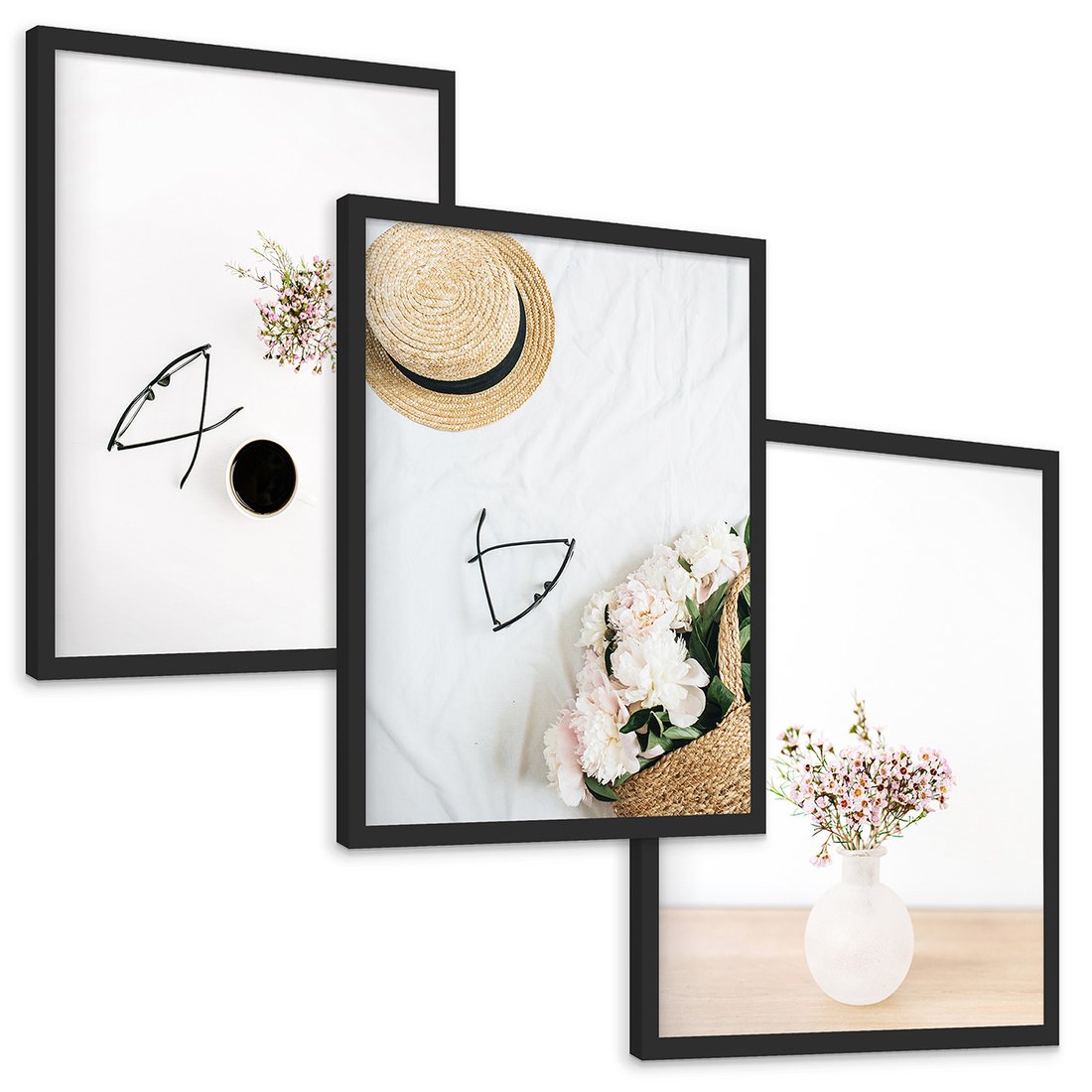 Zestaw obrazy w ramie, plakaty - kwiaty, okulary, kompozycja - rama czarna