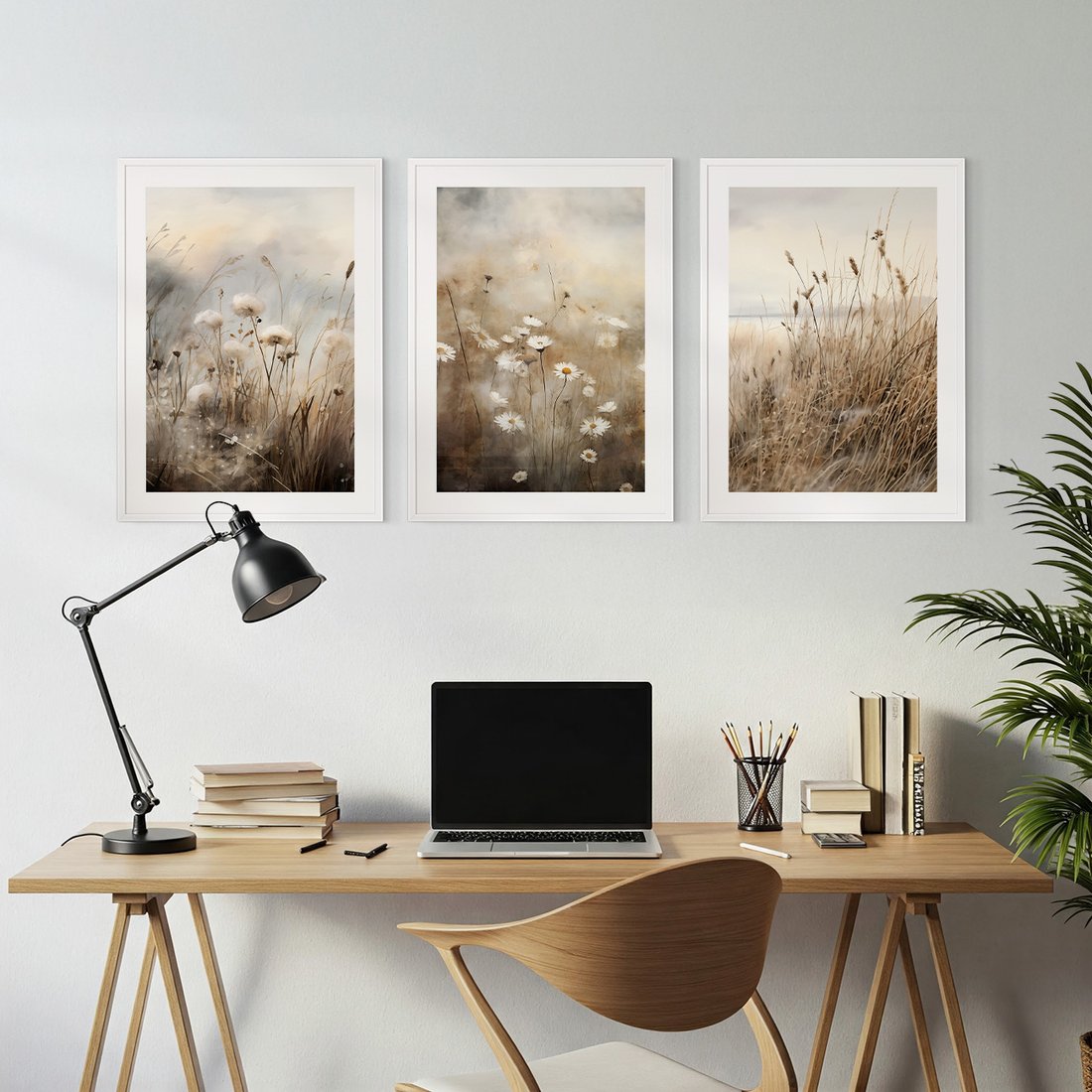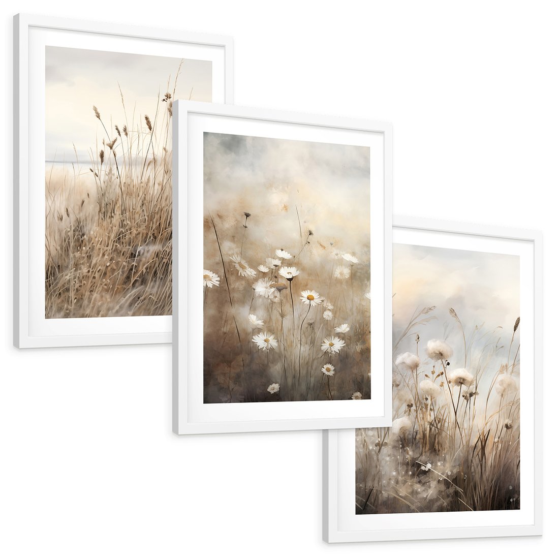 Zestaw obrazy w ramie, plakaty - kwiaty, trawa, delikatne - rama biała