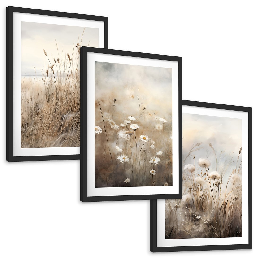 Zestaw obrazy w ramie, plakaty - kwiaty, trawa, delikatne - rama czarna