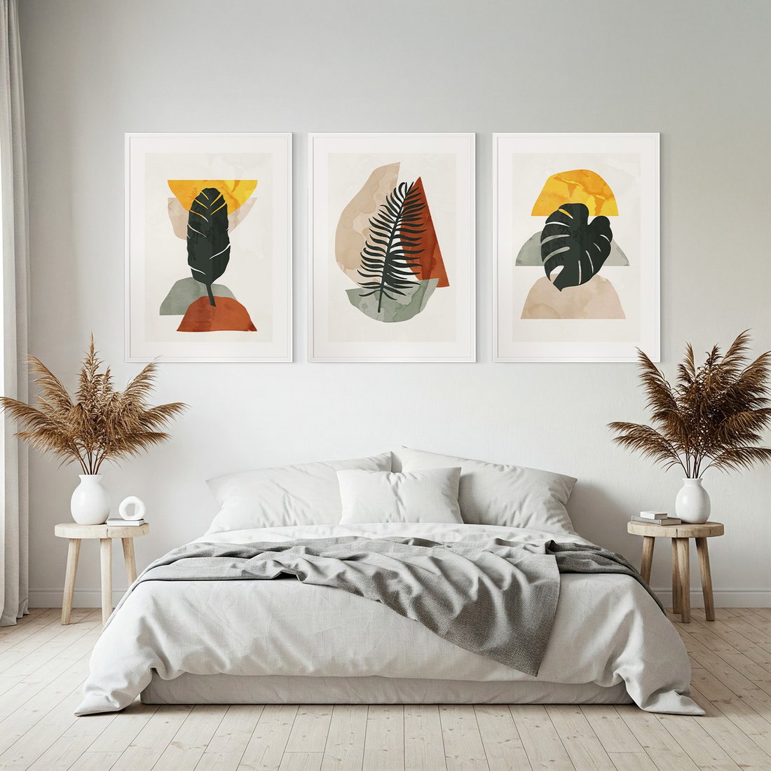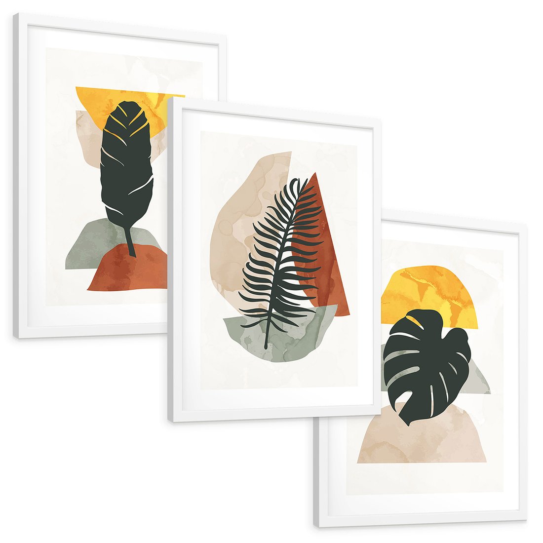 Zestaw obrazy w ramie, plakaty - liście, abstrakcja, rośliny - rama biała