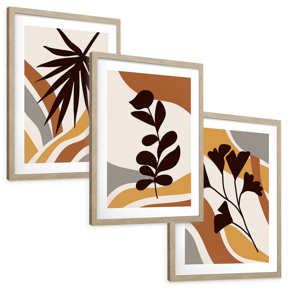 Zestaw obrazy w ramie, plakaty - liście, abstrakcja, rośliny - rama drewno