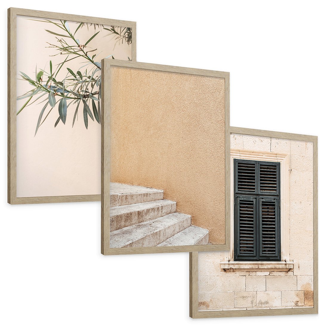 Zestaw obrazy w ramie, plakaty - liście, budynek, okno - rama drewno