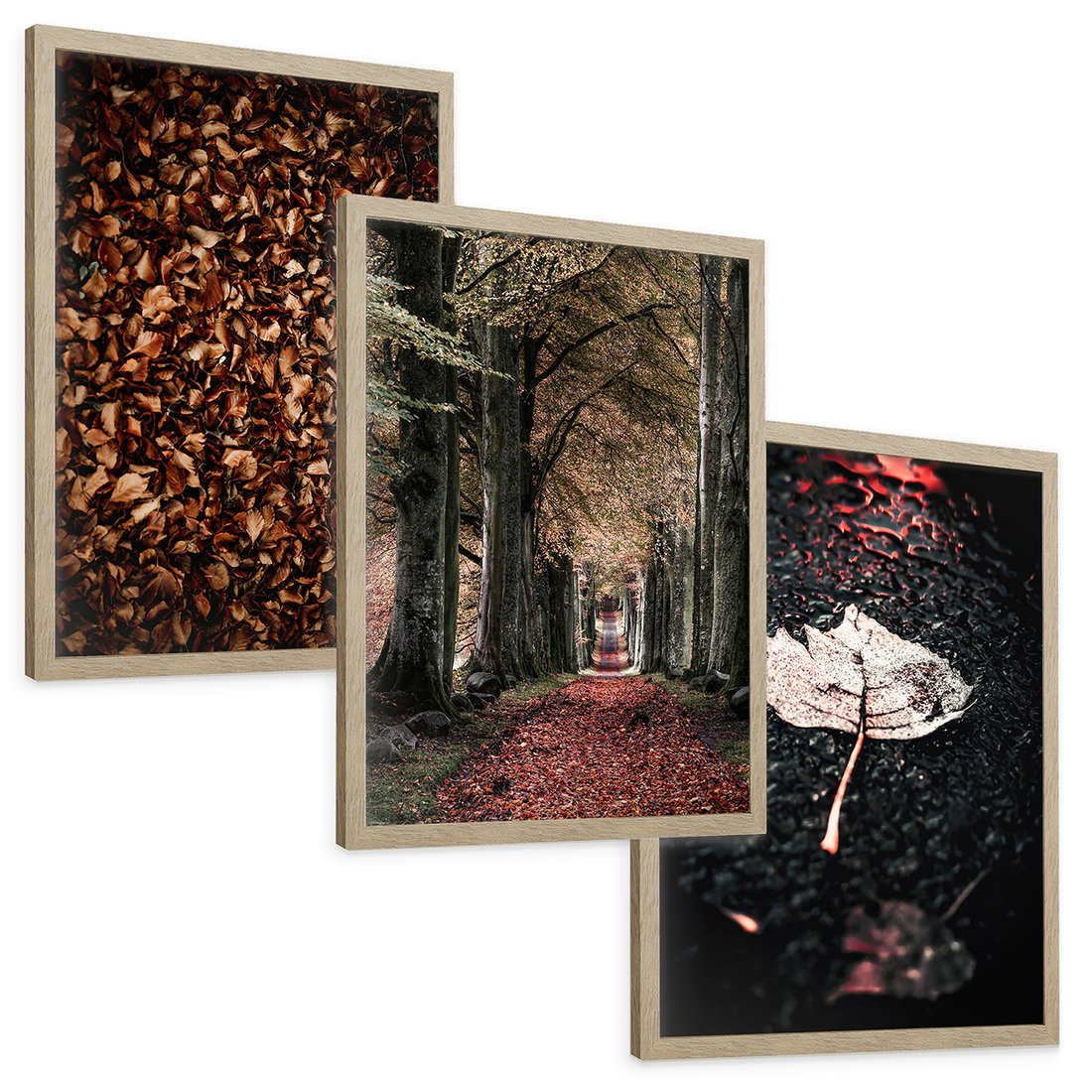 Zestaw obrazy w ramie, plakaty - liście, drzewa, jesień - rama drewno