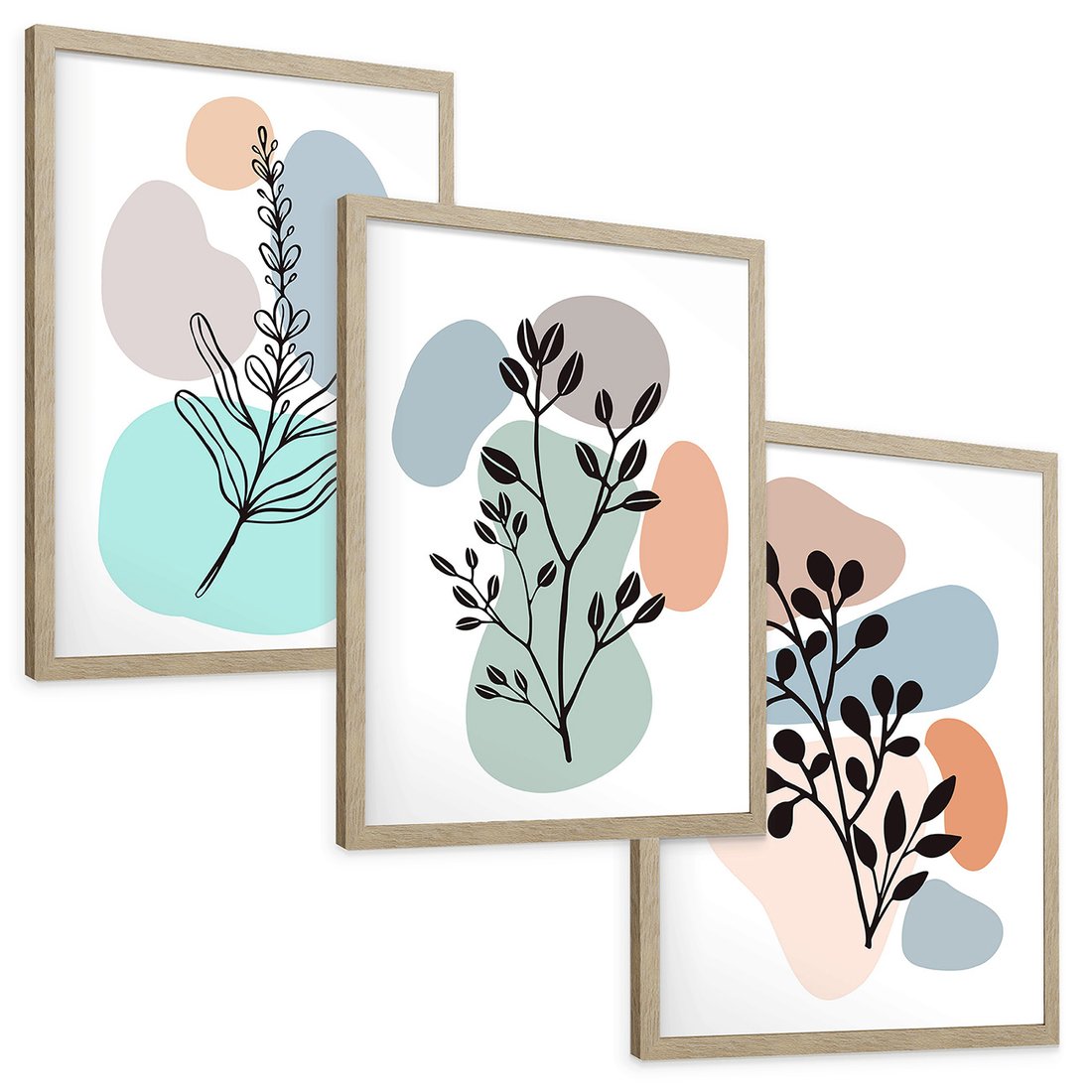 Zestaw obrazy w ramie, plakaty - liście, gałązki, abstrakcja - rama drewno