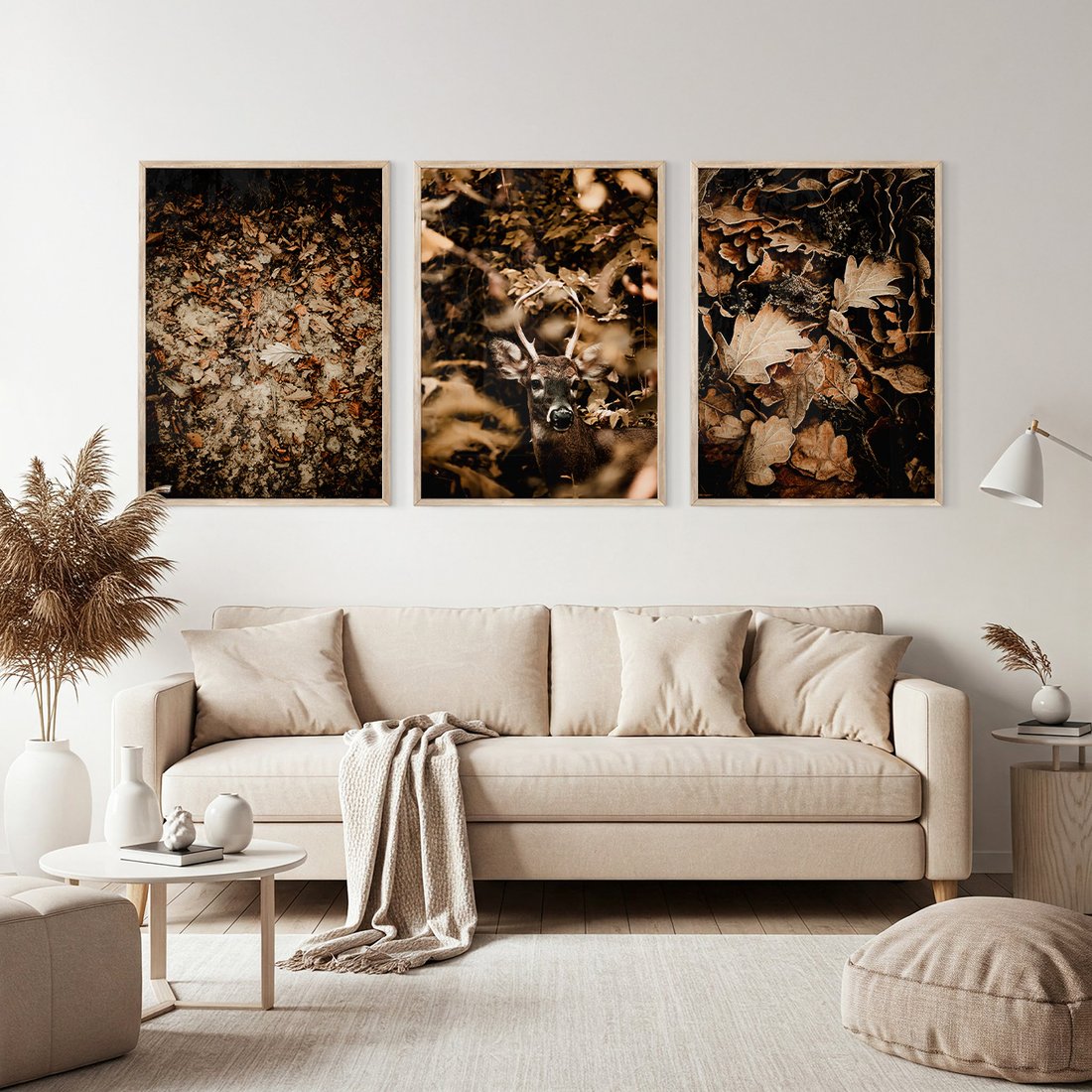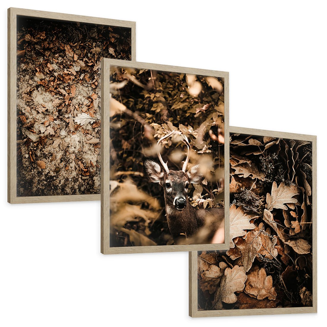 - Zestaw obrazy w ramie, plakaty - liście,jeleń,las